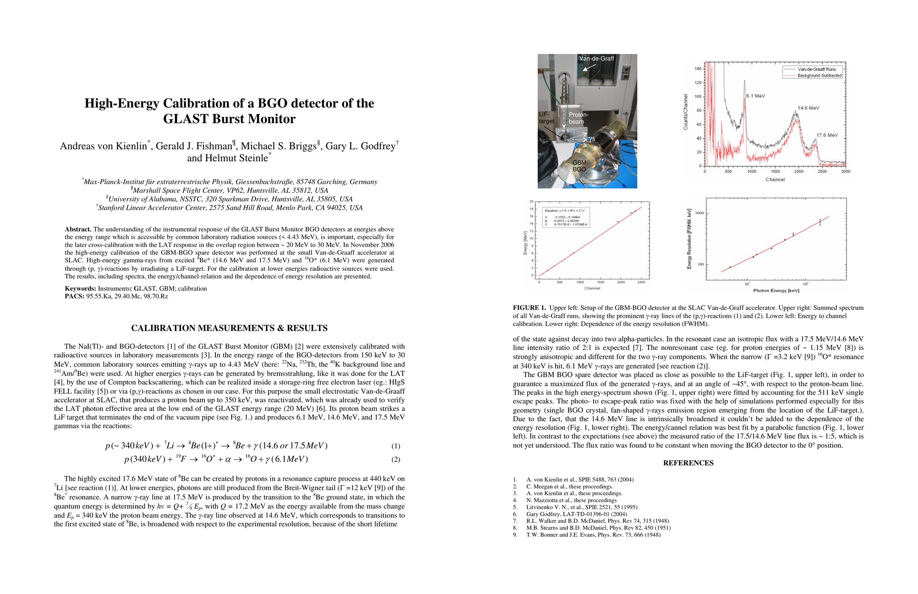 The understanding of the instrumental response of the GLAST Burst Monitor BGO detectors at energies above the energy range which is accessible by common laboratory radiation sources (< 4.43 MeV), is important, especially for the later cross-calibration with the LAT response in the overlap region between ~ 20 MeV to 30 MeV. In November 2006 the high-energy calibration of the GBM-BGO spare detector was performed at the small Van-de-Graaff accelerator at SLAC. High-energy gamma-rays from excited 8Be* (14.6 MeV and 17.5 MeV) and 16O* (6.1 MeV) were generated through (p,gamma)-reactions by irradiating a LiF-target. For the calibration at lower energies radioactive sources were used. The results, including spectra, the energy/channel-relation and the dependence of energy resolution are presented.