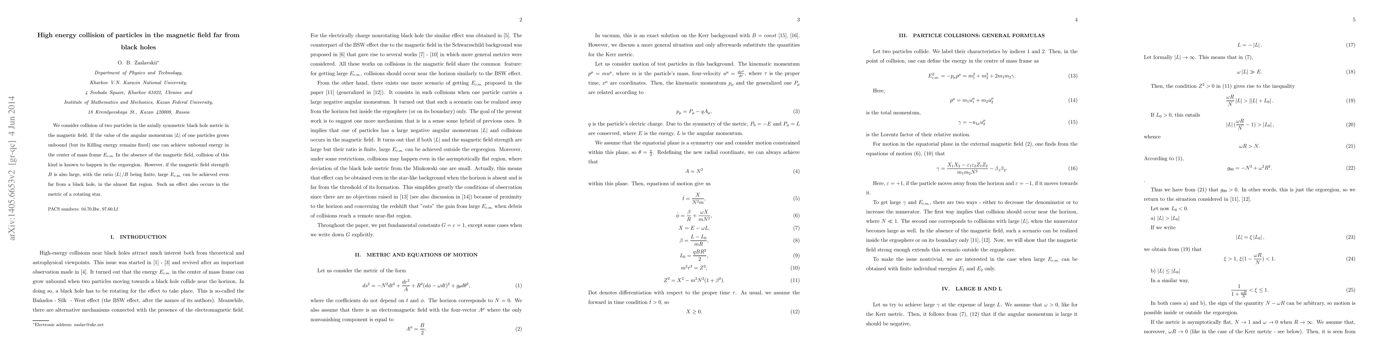 We consider collision of two particles in the axially symmetric black hole metric in the magnetic field. If the value of the angular momentum |L| of one particles grows unbound (but its Killing energy remains fixed) one can achieve unbound energy in the center of mass frame E_{c.m.} In the absence of the magnetic field, collision of this kind is known to happen in the ergoregion. However, if the magnetic field strength B is also large, with the ratio |L|/B being finite, large E_{c.m.} can be achieved even far from a black hole, in the almost flat region. Such an effect also occurs in the metric of a rotating star.