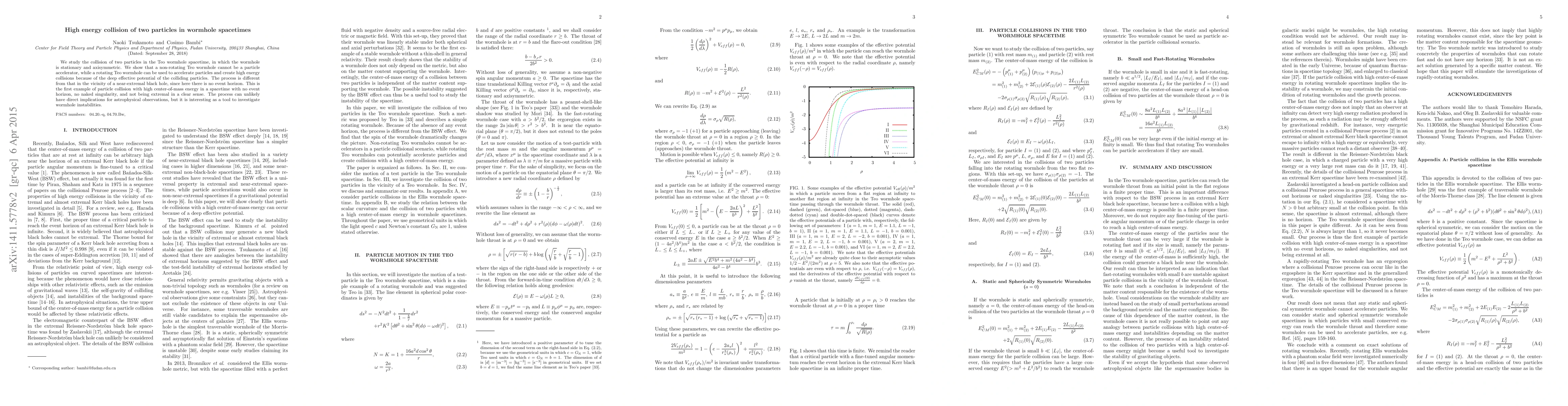 This study investigates the high energy collision of particles in stationary and rotating Teo wormhole spacetimes, revealing that while a non-rotating wormhole cannot accelerate particles, a rotating one can due to its deep effective potential. This process differs from black hole collisions and occurs in a unique spacetime without an event horizon.