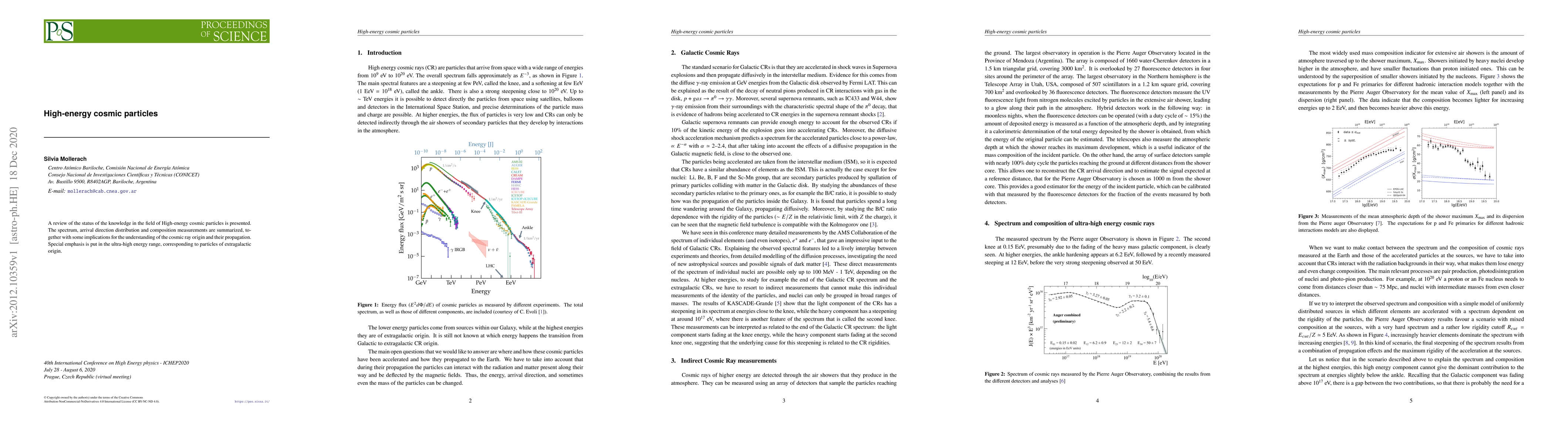 A review of the status of the knowledge in the field of High-energy cosmic particles is presented. The spectrum, arrival direction distribution and composition measurements are summarized, together with some implications for the understanding of the cosmic ray origin and their propagation. Special emphasis is put in the ultra-high energy range, corresponding to particles of extragalactic origin.