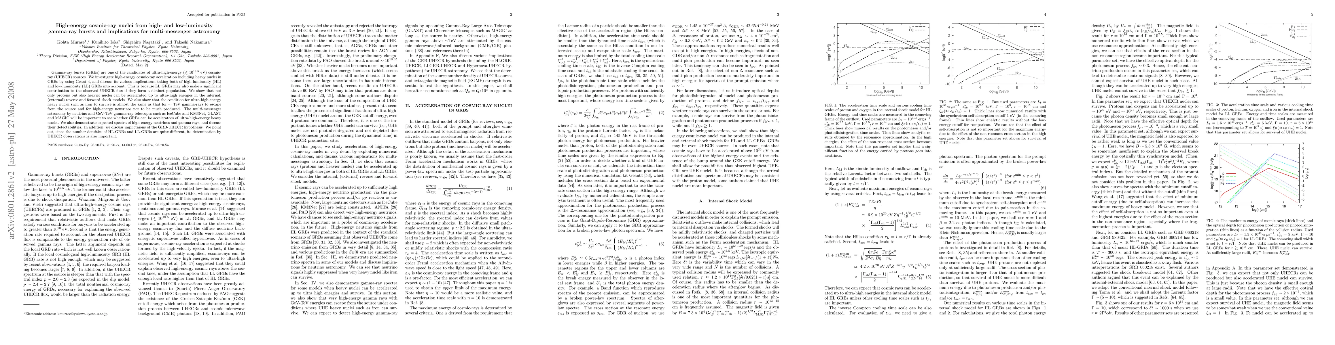 Gamma-ray bursts (GRBs) are one of the candidates of ultra-high-energy (around 10^18.5 eV) cosmic-ray (UHECR) sources. We investigate high-energy cosmic-ray acceleration including heavy nuclei in GRBs by using Geant 4, and discuss its various implications, taking both of high-luminosity (HL) and low-luminosity (LL) GRBs into account. This is because LL GRBs may also make a significant contribution to the observed UHECR flux if they form a distinct population. We show that not only protons but also heavier nuclei can be accelerated up to ultra-high energies in the internal, (external) reverse and forward shock models. We also show that the condition for ultra-high-energy heavy nuclei such as iron to survive is almost the same as that for about TeV gamma-rays to escape from the source and for high-energy neutrinos not to be much produced. The multi-messenger astronomy by neutrino and GeV-TeV gamma-ray telescopes such as IceCube and KM3Net, GLAST and MAGIC will be important to see whether GRBs can be accelerators of ultra-high-energy heavy nuclei. We also demonstrate expected spectra of high-energy neutrinos and gamma rays, and discuss their detectabilities. In addition, we discuss implictaions of the GRB-UHECR hypothesis. We point out, since the number densities of HL-GRBs and LL-GRBs are quite different, its detemination by UHECR observations is also important.
