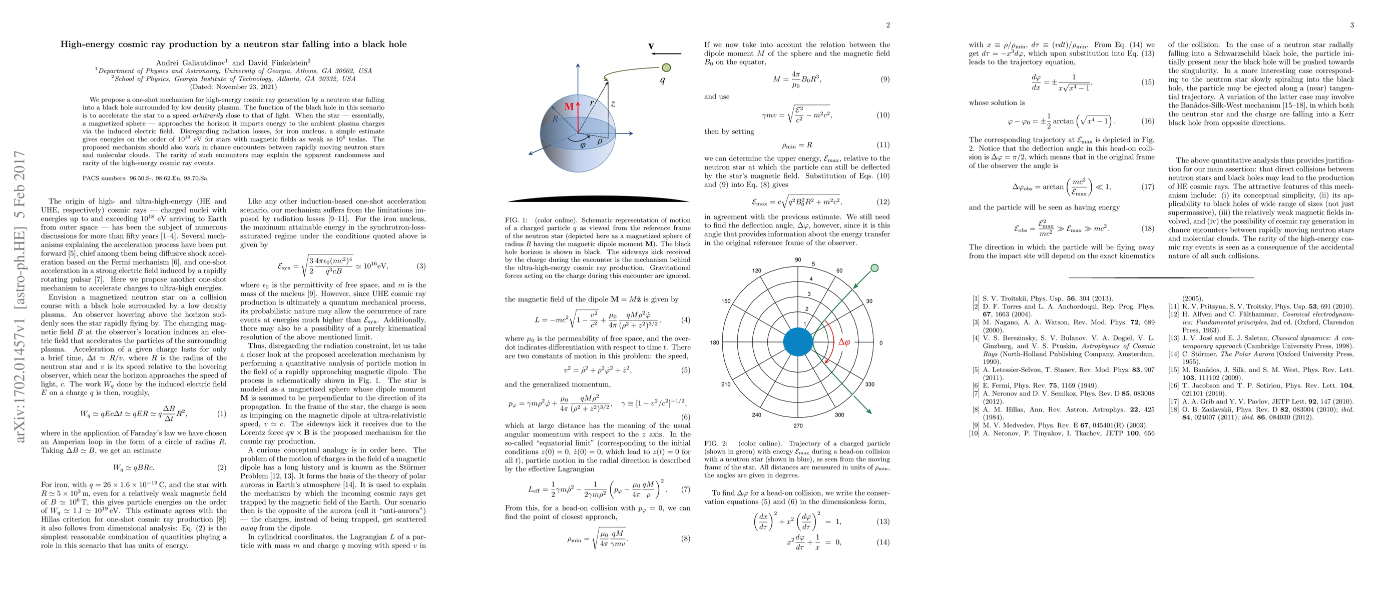 We propose a one-shot mechanism for high-energy cosmic ray generation by a neutron star falling into a black hole surrounded by low density plasma. The function of the black hole in this scenario is to accelerate the star to a speed arbitrarily close to that of light. When the star - essentially, a magnetized sphere - approaches the horizon it imparts energy to the ambient plasma charges via the induced electric field. Disregarding radiation losses, for iron nucleus, a simple estimate gives energies on the order of 10^19 eV for stars with magnetic fields as weak as 10^6 teslas. The proposed mechanism should also work in chance encounters between rapidly moving neutron stars and molecular clouds. The rarity of such encounters may explain the apparent randomness and rarity of the high-energy cosmic ray events.