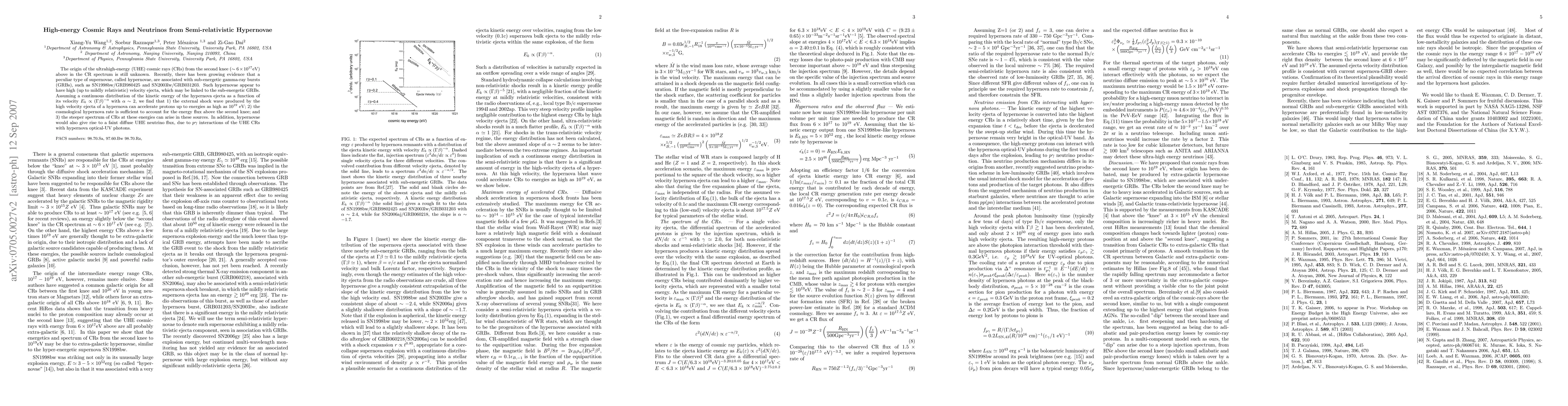 This paper investigates the potential role of semi-relativistic hypernovae in accelerating protons to ultrahigh energies (up to $10^{19}$ eV) and generating the second knee in the cosmic ray spectrum. It also explores the resultant faint diffuse ultrahigh-energy neutrino flux from these sources.