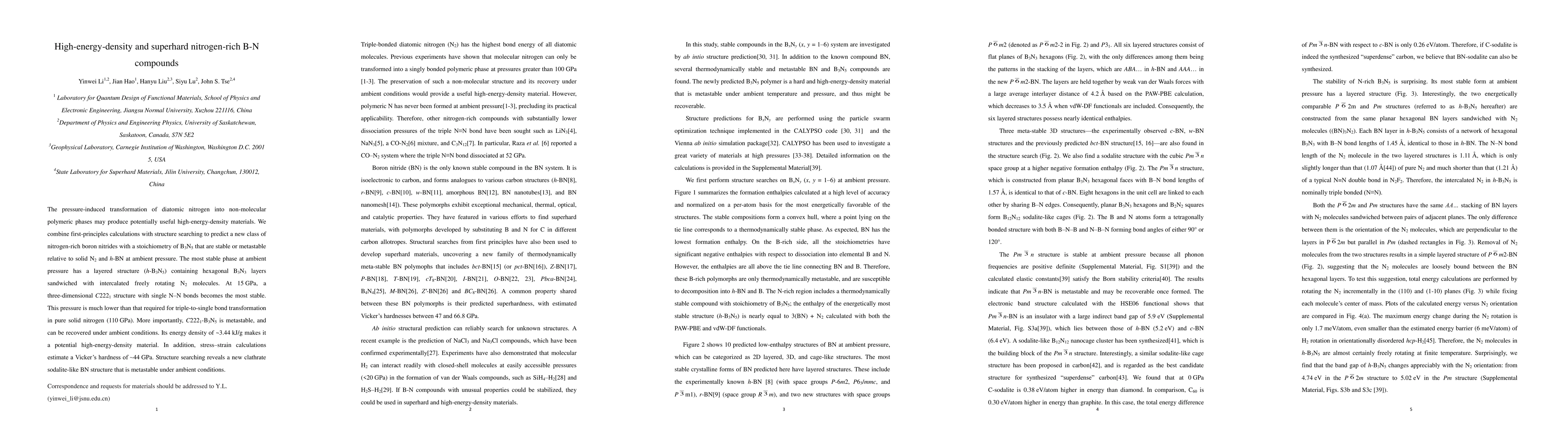 This research predicts a new boron nitride compound, B3N5, stable at ambient pressure with a layered structure. Under pressure, it transforms into a 3D C2221 structure with high energy density (3.44 kJ/g) and hardness (44 GPa), suggesting potential for high-energy-density materials and superhard applications.