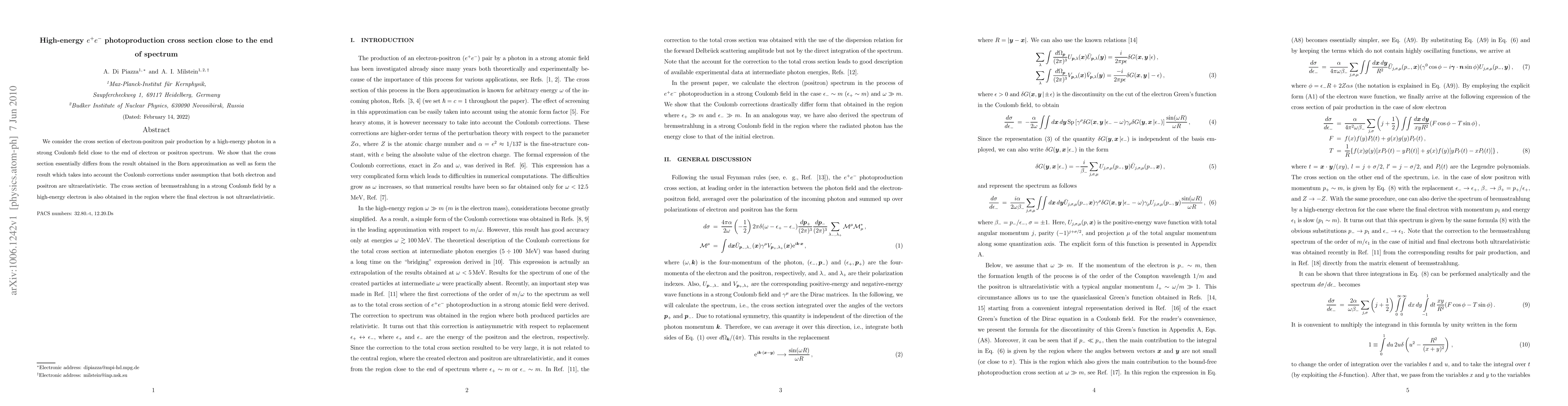 This paper investigates the high-energy $e^+e^-$ photoproduction cross section in a strong Coulomb field near the end of the electron or positron spectrum, revealing significant deviations from both the Born approximation and Coulomb corrections assuming ultrarelativistic particles. The study also derives the bremsstrahlung cross section for high-energy electrons in a strong Coulomb field when the final electron is not ultrarelativistic.