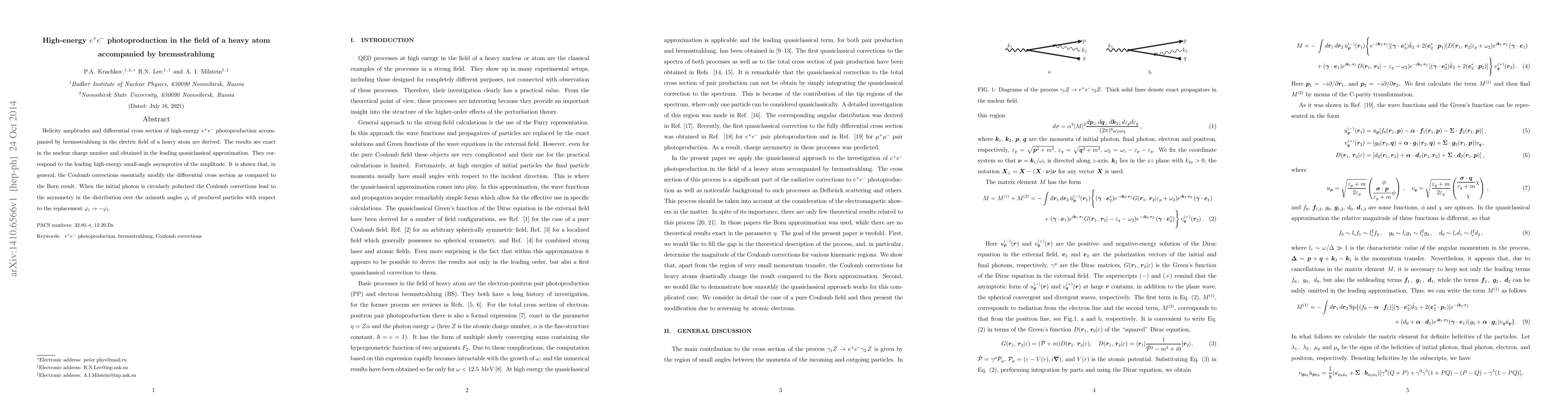 This paper derives the helicity amplitudes and differential cross section for high-energy $e^+e^-$ photoproduction in the electric field of a heavy atom, including bremsstrahlung. The results show significant Coulomb corrections modifying the differential cross section compared to the Born approximation, especially when the initial photon is circularly polarized, leading to asymmetry in particle azimuthal angles.