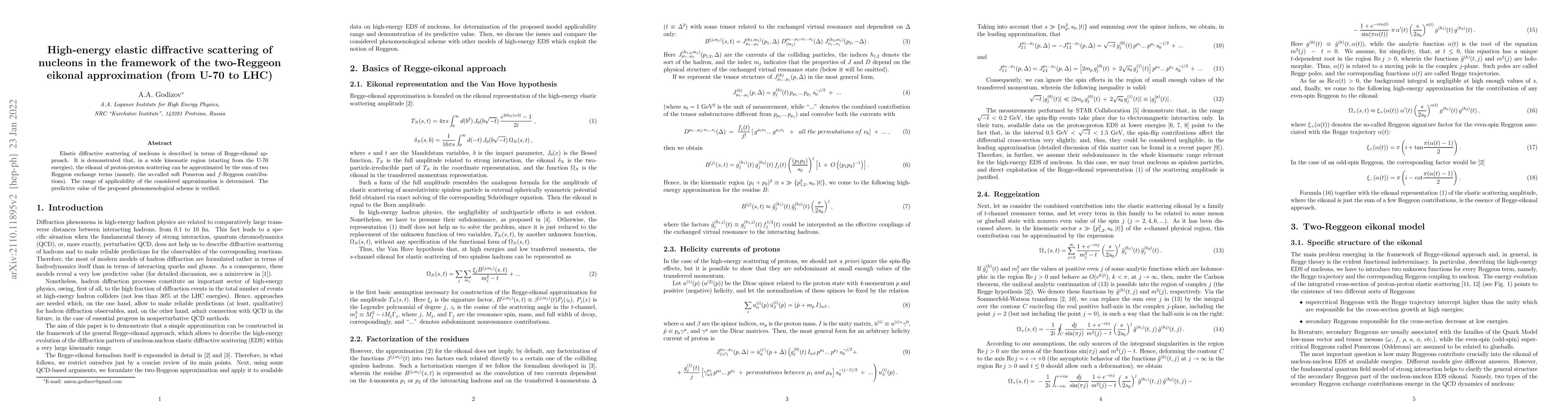 Elastic diffractive scattering of nucleons is described in terms of Regge-eikonal approach. It is demonstrated that, in a wide kinematic region (starting from the U-70 energies), the eikonal of proton-proton scattering can be approximated by the sum of two Reggeon exchange terms (namely, the so-called soft Pomeron and $f$-Reggeon contributions). The range of applicability of the considered approximation is determined. The predictive value of the proposed phenomenological scheme is verified.