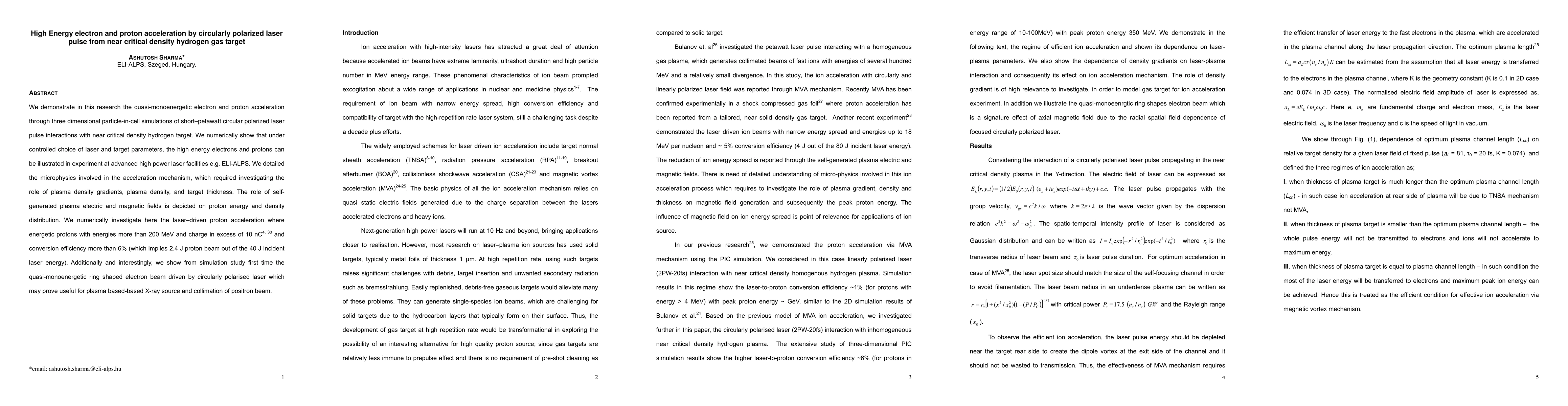 We demonstrate in this research the quasi-monoenergetic electron and proton acceleration through three dimensional particle-in-cell simulations of short petawatt circular polarized laser pulse interactions with near critical density hydrogen target. We numerically show that under controlled choice of laser and target parameters, the high energy electrons and protons can be illustrated in experiment at advanced high power laser facilities eg ELI - ALPS. We detailed the microphysics involved in the acceleration mechanism, which required investigating the role of plasma density gradients, plasma density, and target thickness. The role of selfgenerated plasma electric and magnetic fields is depicted on proton energy and density distribution. We numerically investigate here the laser driven proton acceleration where energetic protons with energies more than 200 MeV and charge in excess of 10 nC and conversion efficiency more than 6 percent (which implies 2.4 J proton beam out of the 40 J incident laser energy). Additionally and interestingly, we show from simulation study first time the quasi-monoenergetic ring shaped electron beam driven by circularly polarised laser which may prove useful for plasma based-based X-ray source and collimation of positron beam.