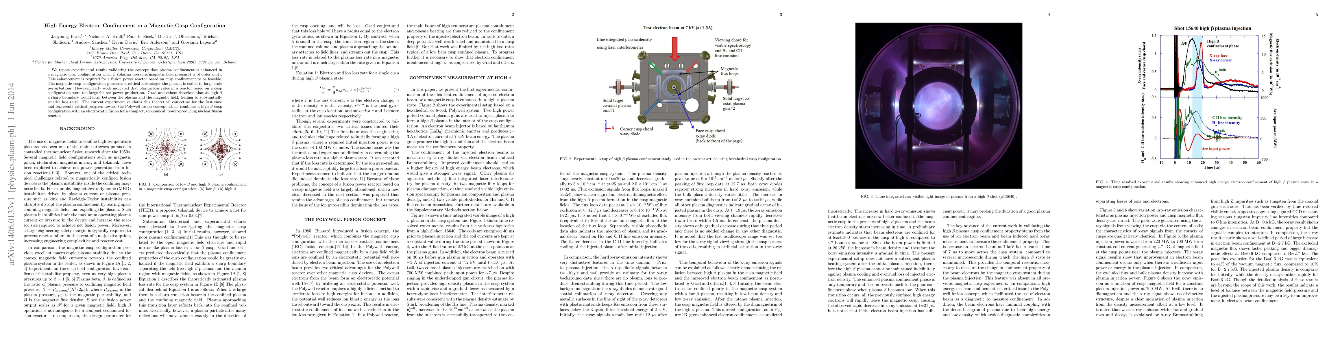 We report experimental results validating the concept that plasma confinement is enhanced in a magnetic cusp configuration when beta (plasma pressure/magnetic field pressure) is order of unity. This enhancement is required for a fusion power reactor based on cusp confinement to be feasible. The magnetic cusp configuration possesses a critical advantage: the plasma is stable to large scale perturbations. However, early work indicated that plasma loss rates in a reactor based on a cusp configuration were too large for net power production. Grad and others theorized that at high beta a sharp boundary would form between the plasma and the magnetic field, leading to substantially smaller loss rates. The current experiment validates this theoretical conjecture for the first time and represents critical progress toward the Polywell fusion concept which combines a high beta cusp configuration with an electrostatic fusion for a compact, economical, power-producing nuclear fusion reactor.