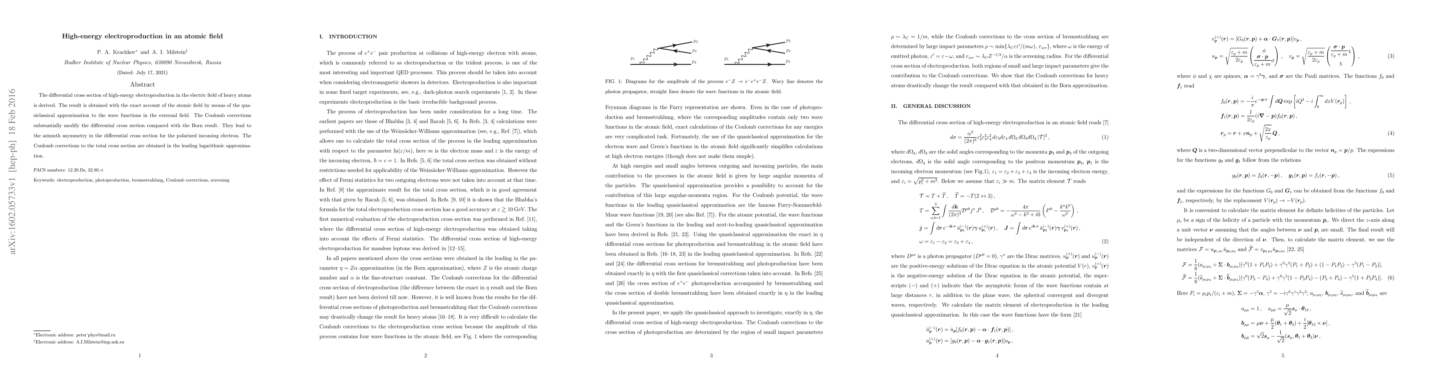 This paper derives the differential cross section for high-energy electroproduction in heavy atomic fields, employing the quasiclassical approximation to account for the atomic field. It finds significant Coulomb corrections that modify the cross section and introduce azimuthal asymmetry for polarized electrons.