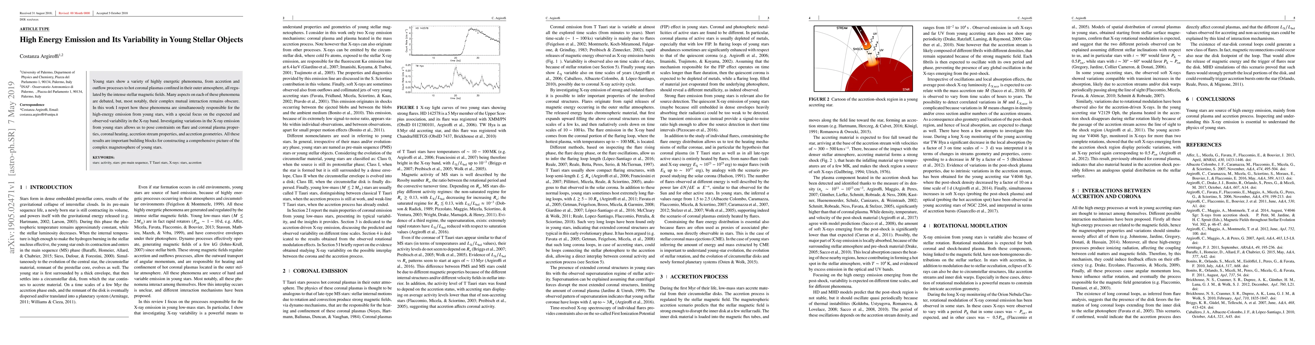 Young stars show a variety of highly energetic phenomena, from accretion and outflow processes to hot coronal plasmas confined in their outer atmosphere, all regulated by the intense stellar magnetic fields. Many aspects on each of these phenomena are debated, but, most notably, their complex mutual interaction remains obscure. In this work I report how these phenomena are simultaneously responsible for the high-energy emission from young stars, with a special focus on the expected and observed variability in the X-ray band. Investigating variations in the X-ray emission from young stars allows us to pose constraints on flare and coronal plasma properties, coronal heating, accretion stream properties, and accretion geometries. All these results are important building blocks for constructing a comprehensive picture of the complex magnetosphere of young stars.