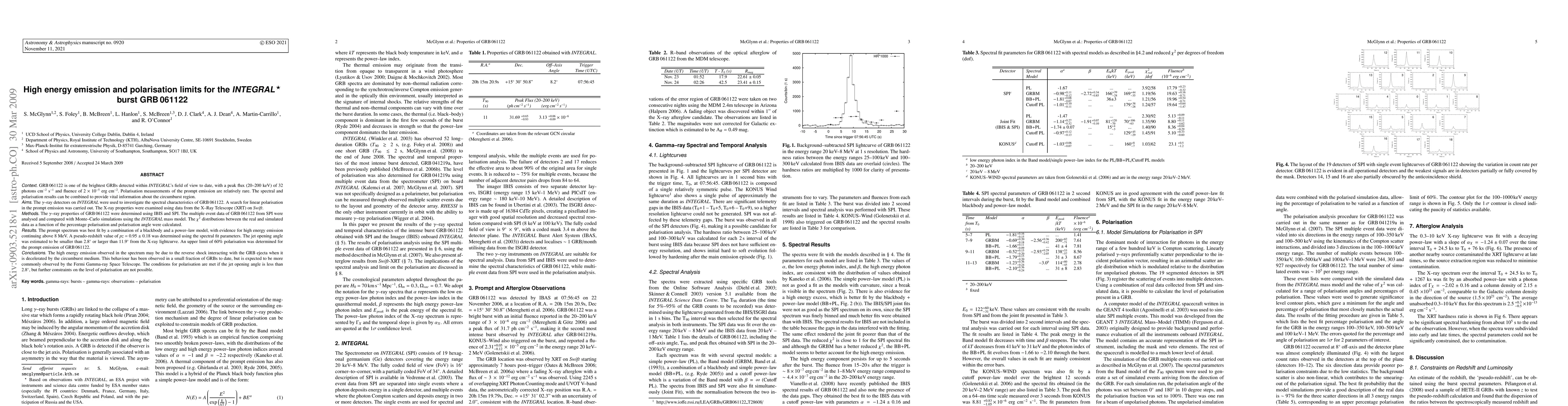 The research on GRB 061122, one of the brightest gamma-ray bursts detected by INTEGRAL, used its two gamma-ray detectors to study its spectral characteristics. A blackbody and power-law model best described the spectrum, revealing high-energy emission extending above 8 MeV. The study estimated a pseudo-redshift, isotropic energy, and jet opening angle. An upper limit of 60% polarization was set for the burst's prompt emission. The high-energy emission may result from reverse shock interaction with the burst ejecta, a phenomenon expected to be observed more often with the Fermi Gamma-ray Space Telescope. Polarization conditions were met if the jet opening angle was less than 2.8 degrees, but further polarization constraints couldn't be determined.