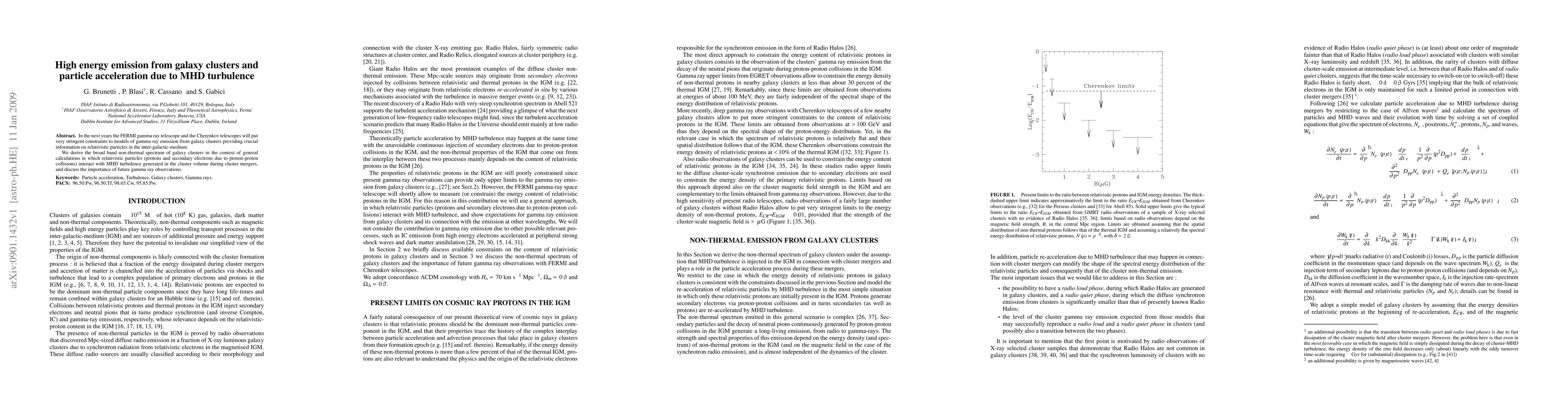 This paper investigates high energy emissions from galaxy clusters, attributing them to particle acceleration via magnetohydrodynamic (MHD) turbulence during cluster mergers. Future gamma ray observations from FERMI and Cherenkov telescopes will provide critical insights into the relativistic particles and non-thermal spectrum in the intergalactic medium.