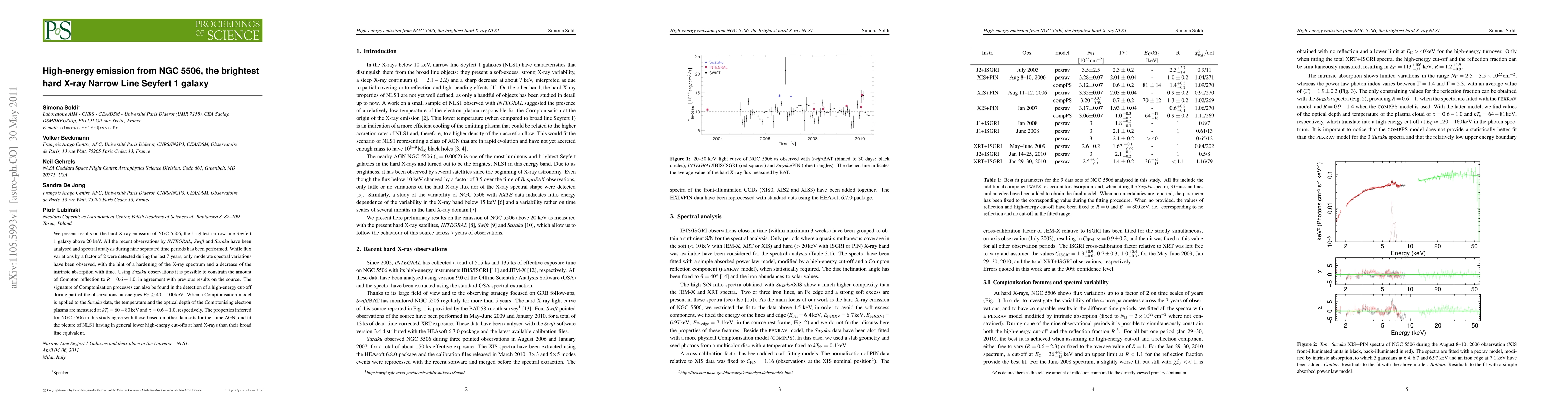 We present results on the hard X-ray emission of NGC 5506, the brightest narrow line Seyfert 1 galaxy above 20 keV. All the recent observations by INTEGRAL, Swift and Suzaku have been analysed and spectral analysis during nine separated time periods has been performed. While flux variations by a factor of 2 were detected during the last 7 years, only moderate spectral variations have been observed, with the hint of a hardening of the X-ray spectrum and a decrease of the intrinsic absorption with time. Using Suzaku observations it is possible to constrain the amount of Compton reflection to R = 0.6-1.0, in agreement with previous results on the source. The signature of Comptonisation processes can also be found in the detection of a high-energy cut-off during part of the observations, at Ec = 40-100 keV. When a Comptonisation model is applied to the Suzaku data, the temperature and the optical depth of the Comptonising electron plasma are measured at kT = 60-80 keV and tau = 0.6-1.0, respectively. The properties inferred for NGC 5506 in this study agree with those based on other data sets for the same AGN, and fit the picture of NLS1 having in general lower high-energy cut-offs at hard X-rays than their broad line equivalent.