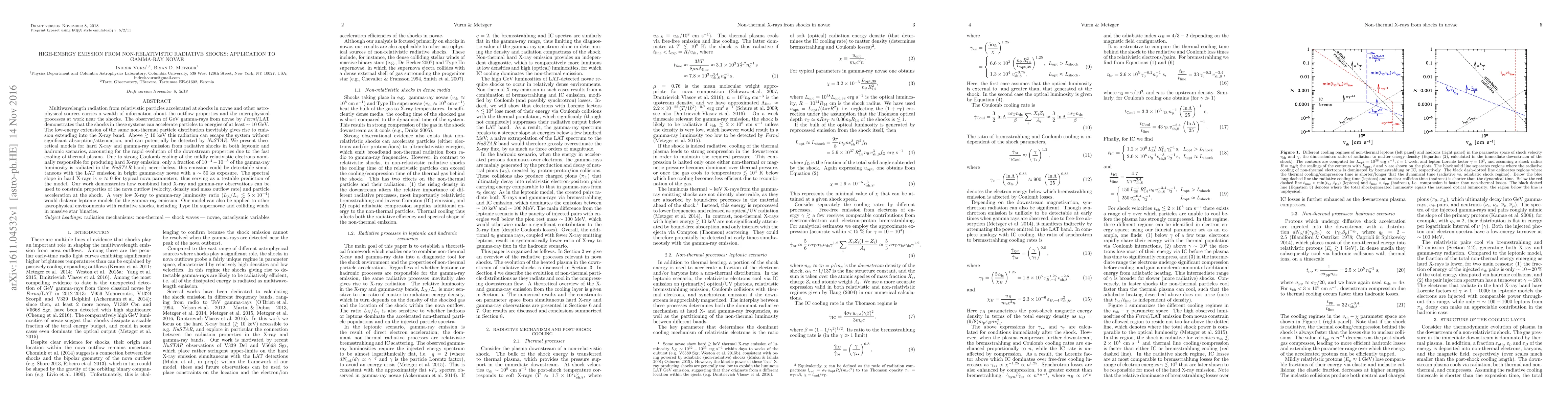 This paper presents theoretical models for high-energy emission from radiative shocks in gamma-ray novae, showing how GeV gamma-ray and hard X-ray observations can constrain nova outflow properties and particle acceleration. It predicts that only a small fraction of gamma-ray luminosity will be detectable in the NuSTAR band, but simultaneous observations could provide insights into the shock processes.
