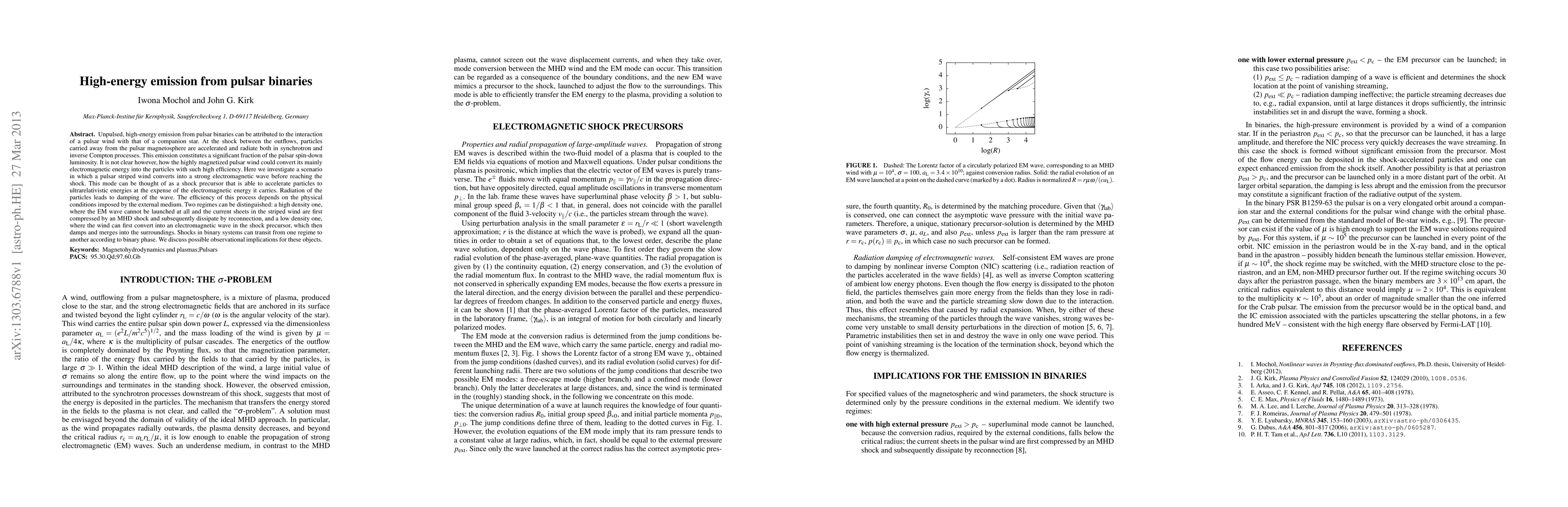 This paper explores high-energy emissions from pulsar binaries, attributing them to interactions between pulsar winds and companion star winds. It proposes a mechanism where a pulsar striped wind converts into an electromagnetic wave before reaching the shock, efficiently accelerating particles and damping the wave, with efficiency varying based on the external medium's density.