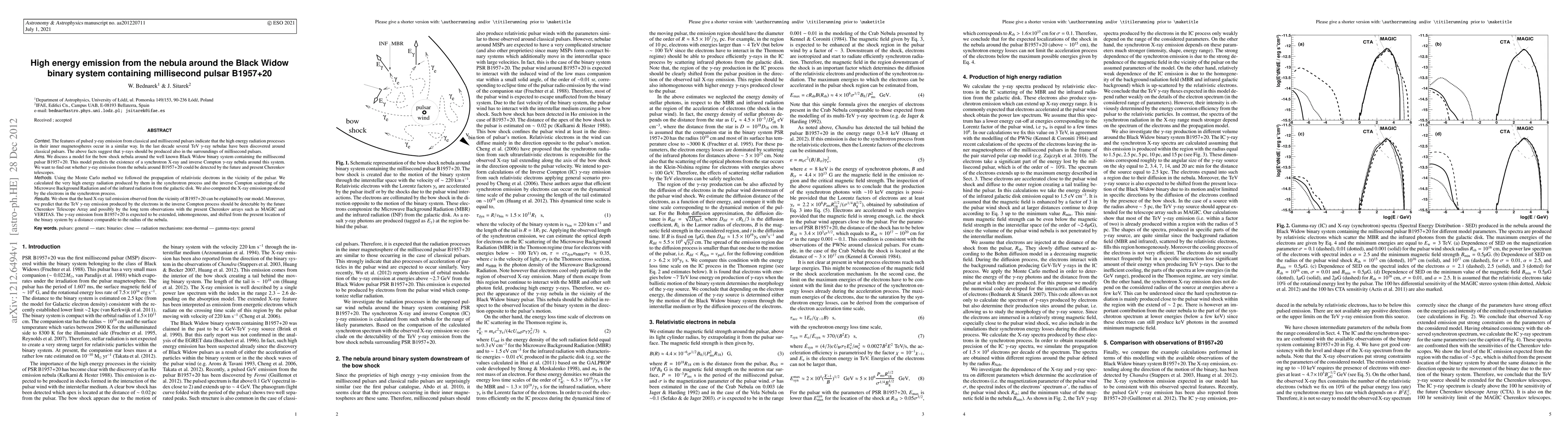 This paper models the high energy emission from the nebula around the Black Widow binary system containing the millisecond pulsar B1957+20, predicting the existence of a synchrotron X-ray and inverse Compton $\gamma$-ray nebula. It suggests that the $\gamma$-ray emission from this system could be detectable by future Cherenkov Telescope Array and possibly by current arrays like MAGIC and VERITAS.