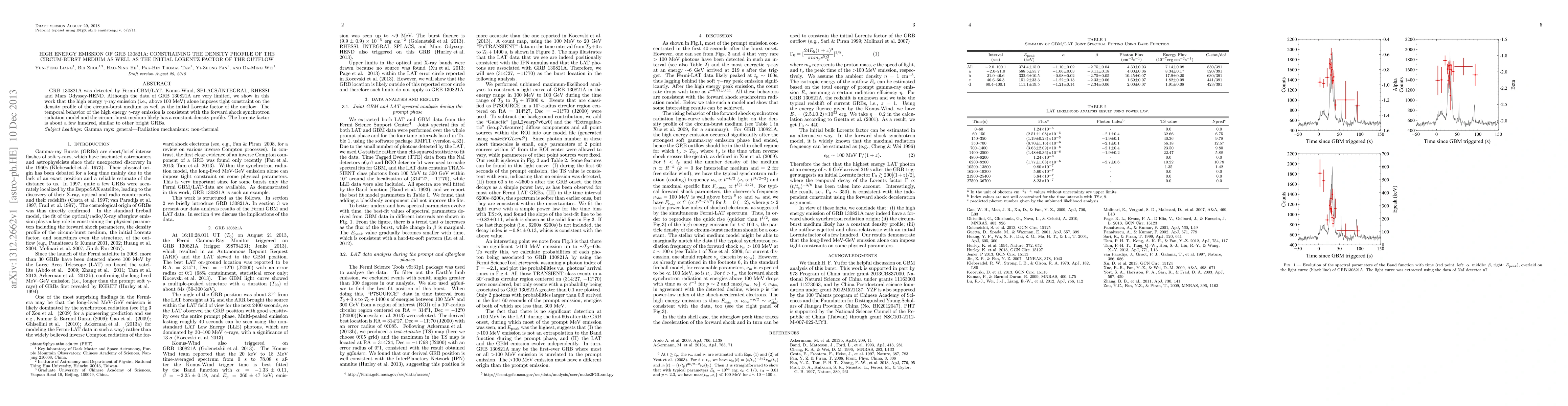 A study of GRB 130821A reveals that high energy gamma-ray emission constrains the density profile of the circum-burst medium and the initial Lorentz factor of the outflow to be around a few hundred, similar to other bright GRBs.