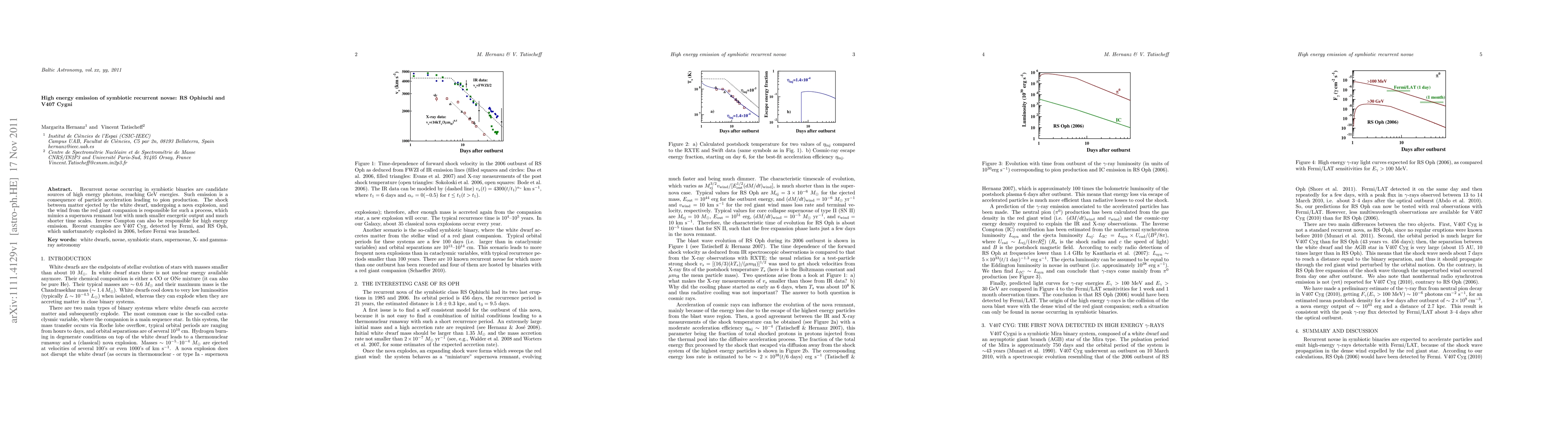 Recurrent novae occurring in symbiotic binaries are candidate sources of high energy photons, reaching GeV energies. Such emission is a consequence of particle acceleration leading to pion production. The shock between matter ejected by the white dwarf, undergoing a nova explosion, and the wind from the red giant companion is responsible for such a process, which mimics a supernova remnant but with much smaller energetic output and much shorter time scales. Inverse Compton can also be responsible for high energy emission. Recent examples are V407 Cyg, detected by Fermi, and RS Oph, which unfortunately exploded in 2006, before Fermi was launched.