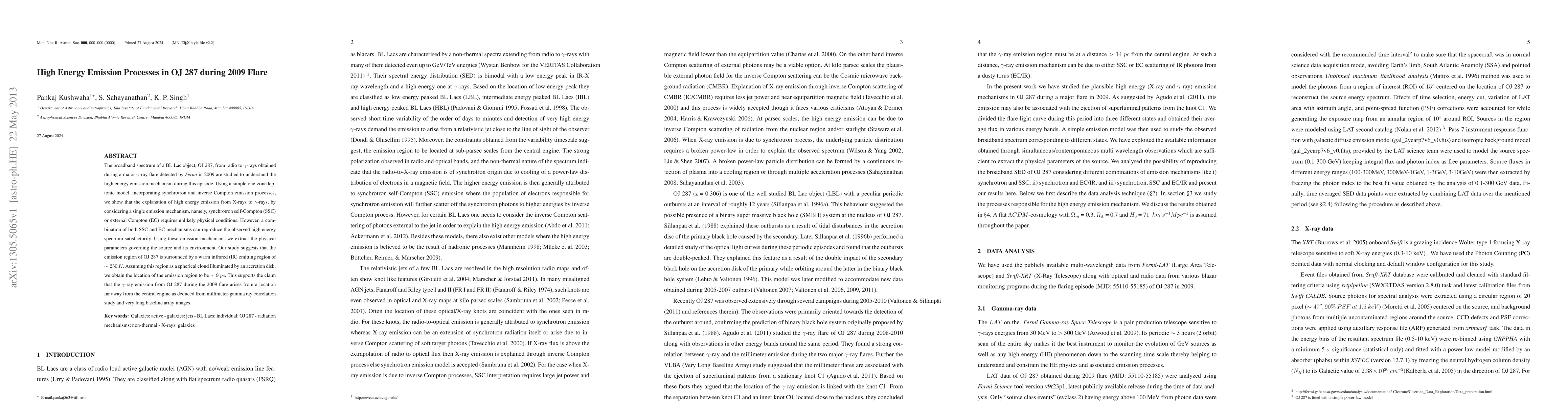 This paper investigates the high energy emission processes in OJ 287 during a 2009 gamma-ray flare, finding that a combination of synchrotron self-Compton (SSC) and external Compton (EC) mechanisms best explains the observed spectrum. The study suggests the emission region is located about 9 pc away from the central engine, supported by infrared and millimeter observations.