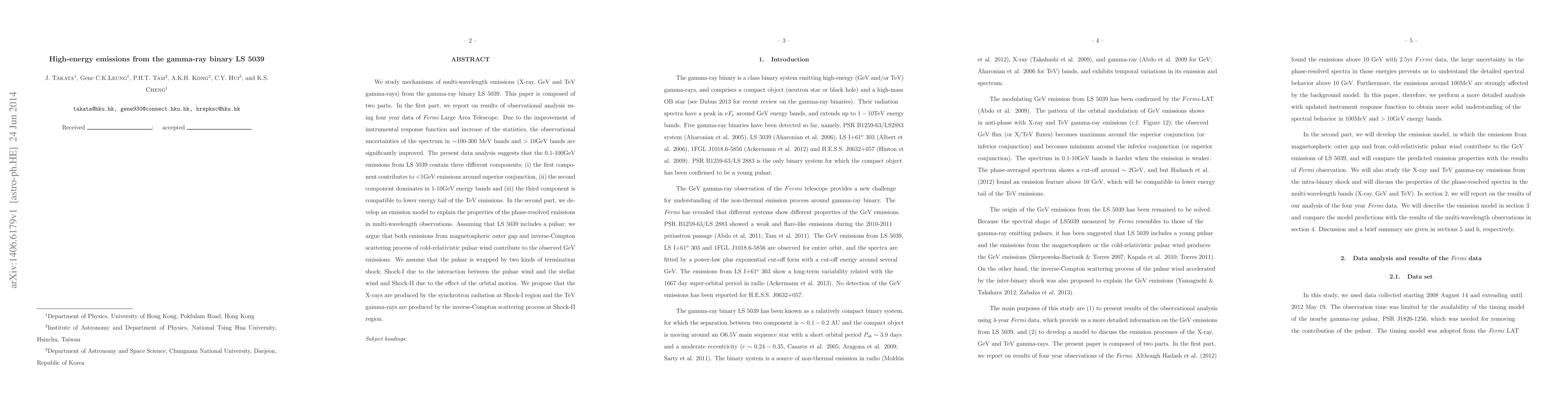 This paper analyzes multi-wavelength emissions from the gamma-ray binary LS 5039, identifying three distinct emission components across GeV bands, and proposes a model attributing GeV emissions to magnetospheric processes and TeV emissions to inverse-Compton scattering in termination shock regions around a pulsar.