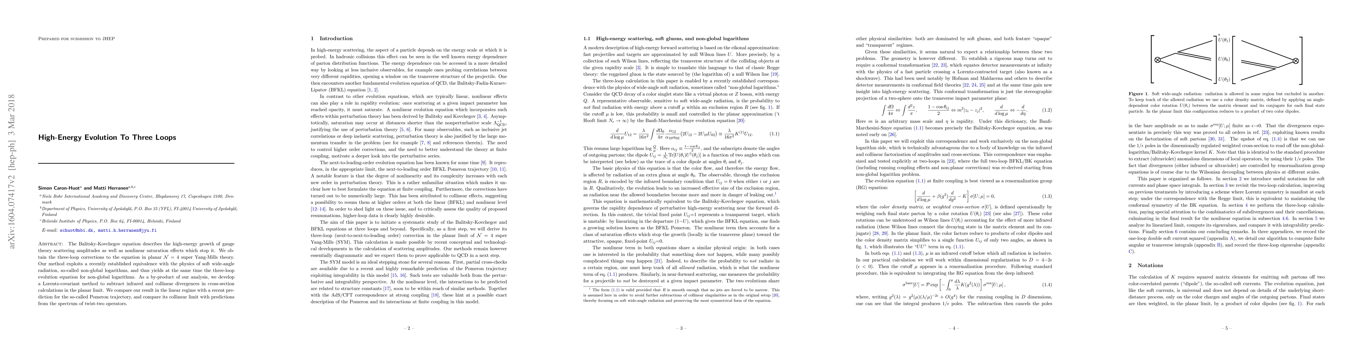 The Balitsky-Kovchegov equation describes the high-energy growth of gauge theory scattering amplitudes as well as nonlinear saturation effects which stop it. We obtain the three-loop corrections to this equation in planar $\mathcal{N}=4$ super Yang-Mills theory. Our method exploits a recently established equivalence with the physics of soft wide-angle radiation, so-called non-global logarithms, and thus yields at the same time the three-loop evolution equation for non-global logarithms. As a by-product of our analysis, we develop a Lorentz-covariant method to subtract infrared and collinear divergences in cross-section calculations in the planar limit. We compare our result in the linear regime with a recent prediction for the so-called Pomeron trajectory, and compare its collinear limit with predictions from the spectrum of twist-two operators.