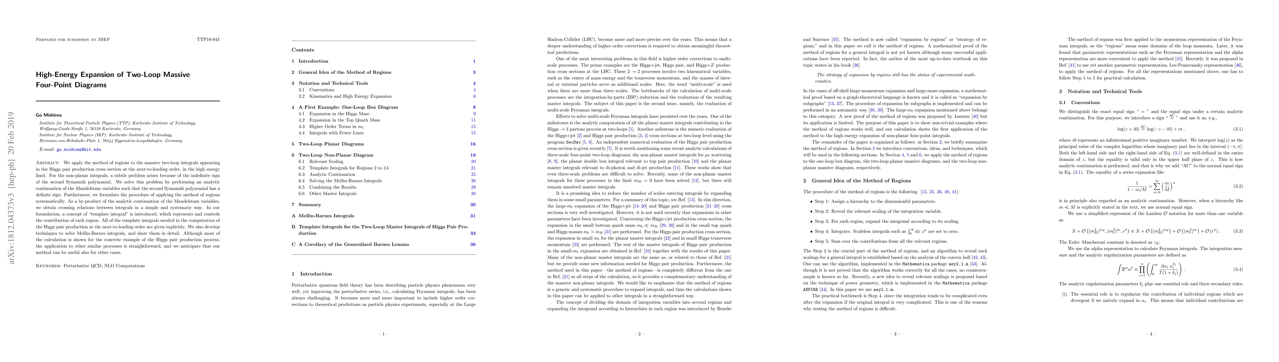 We apply the method of regions to the massive two-loop integrals appearing in the Higgs pair production cross section at the next-to-leading order, in the high energy limit. For the non-planar integrals, a subtle problem arises because of the indefinite sign of the second Symanzik polynomial. We solve this problem by performing an analytic continuation of the Mandelstam variables such that the second Symanzik polynomial has a definite sign. Furthermore, we formulate the procedure of applying the method of regions systematically. As a by-product of the analytic continuation of the Mandelstam variables, we obtain crossing relations between integrals in a simple and systematic way. In our formulation, a concept of "template integral" is introduced, which represents and controls the contribution of each region. All of the template integrals needed in the computation of the Higgs pair production at the next-to-leading order are given explicitly. We also develop techniques to solve Mellin-Barnes integrals, and show them in detail. Although most of the calculation is shown for the concrete example of the Higgs pair production process, the application to other similar processes is straightforward, and we anticipate that our method can be useful also for other cases.