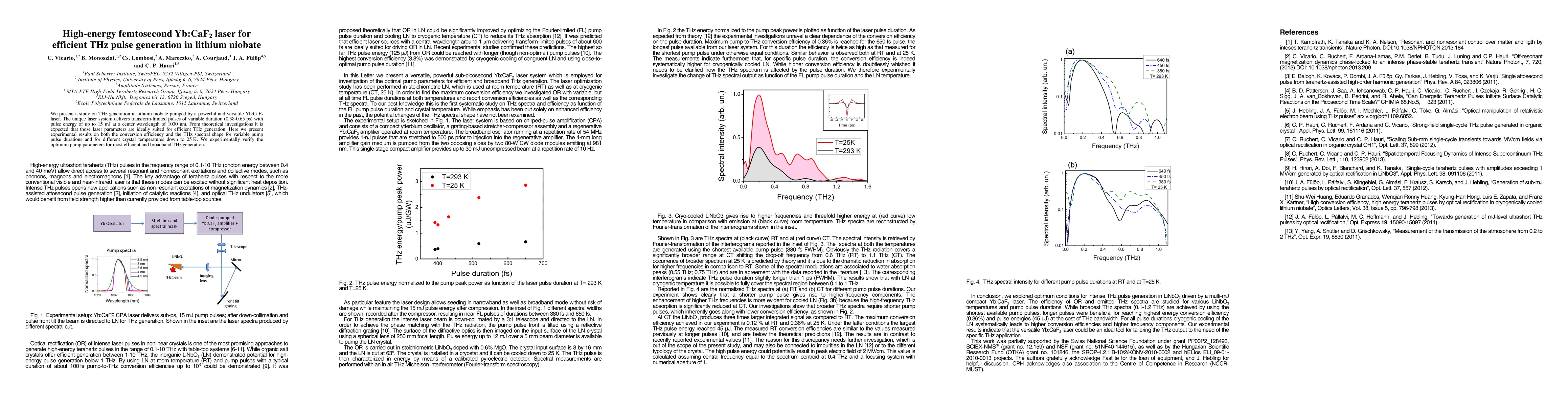 This study investigates THz pulse generation in lithium niobate using a high-energy Yb:CaF2 femtosecond laser, achieving efficient conversion and broadband THz spectra. Experimental results identify optimal pump parameters for maximum efficiency and spectral coverage.