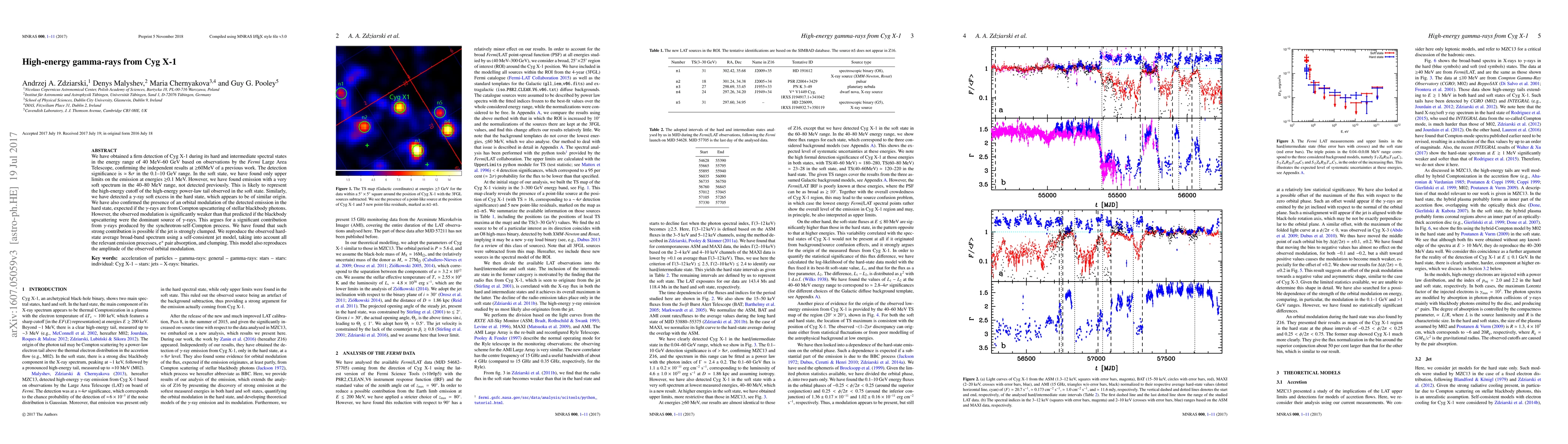 We have obtained a firm detection of Cyg X-1 during its hard and intermediate spectral states in the energy range of 40 MeV--60 GeV based on observations by the Fermi Large Area Telescope, confirming the independent results at $\geq$60MeV of a previous work. The detection significance is $\simeq\!8\sigma$ in the 0.1--10 GeV range. In the soft state, we have found only upper limits on the emission at energies $\gtrsim$0.1 MeV. However, we have found emission with a very soft spectrum in the 40--80 MeV range, not detected previously. This is likely to represent the high-energy cutoff of the high-energy power-law tail observed in the soft state. Similarly, we have detected a $\gamma$-ray soft excess in the hard state, which appears to be of similar origin. We have also confirmed the presence of an orbital modulation of the detected emission in the hard state, expected if the $\gamma$-rays are from Compton upscattering of stellar blackbody photons. However, the observed modulation is significantly weaker than that predicted if the blackbody upscattering were the dominant source of $\gamma$-rays. This argues for a significant contribution from $\gamma$-rays produced by the synchrotron-self-Compton process. We have found that such strong contribution is possible if the jet is strongly clumped. We reproduce the observed hard-state average broad-band spectrum using a self-consistent jet model, taking into account all the relevant emission processes, e$^\pm$ pair absorption, and clumping. This model also reproduces the amplitude of the observed orbital modulation.