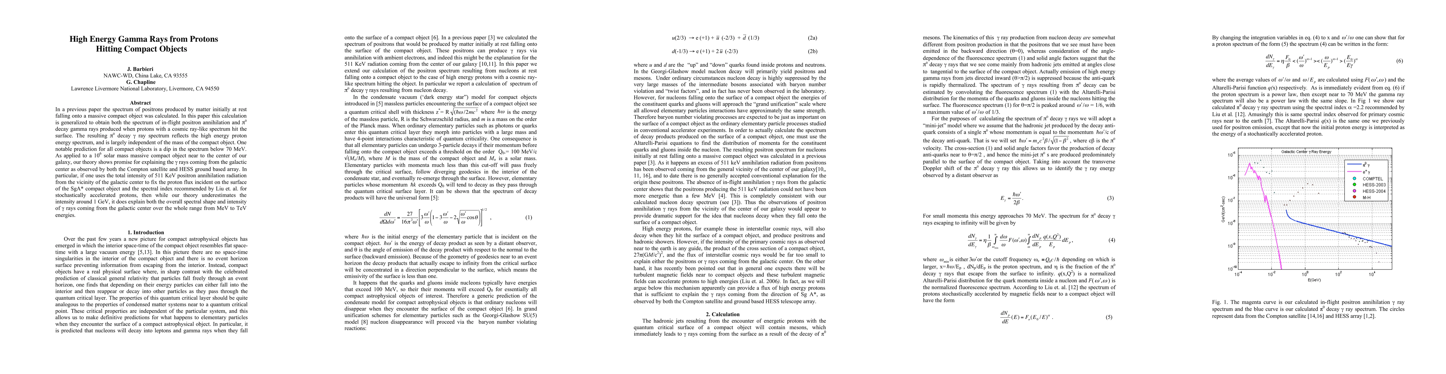 In a previous paper the spectrum of positrons produced by matter initially at rest falling onto a massive compact object was calculated. In this paper this calculation is generalized to obtain both the spectrum of in-flight positron annihilation and pi0 decay gamma rays produced when protons with a cosmic ray-like spectrum hit the surface. The resulting pi0 decay gamma ray spectrum reflects the high energy proton energy spectrum, and is largely independent of the mass of the compact object. One notable prediction for all compact objects is a dip in the spectrum below 70 MeV. As applied to the 10^6 solar mass massive compact object near to the center of our galaxy, our theory shows promise for explaining the gamma rays coming from the galactic center as observed by both the Compton satellite and HESS ground based array.