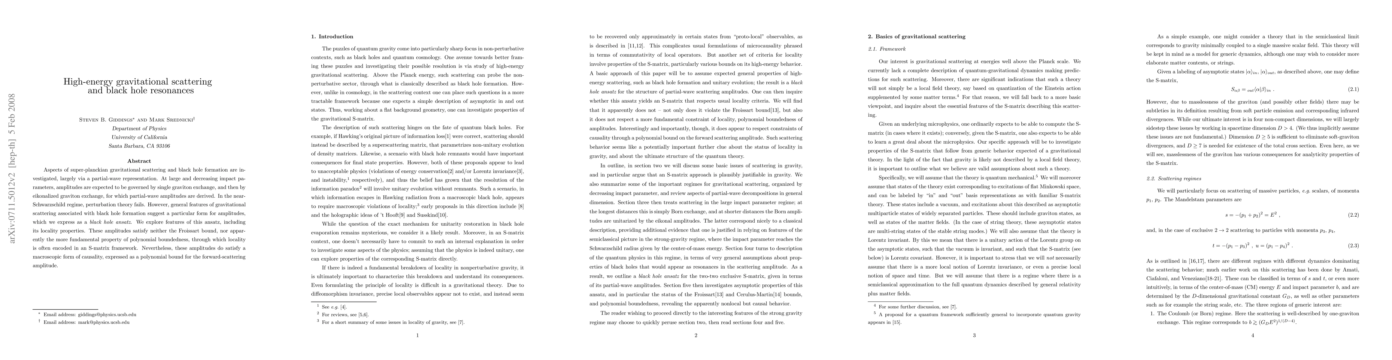 This paper investigates high-energy gravitational scattering and black hole resonances, deriving partial-wave amplitudes for super-Planckian scattering and proposing a black hole ansatz. Despite failing to satisfy the Froissart and polynomial boundedness bounds, the derived amplitudes uphold a macroscopic form of causality.