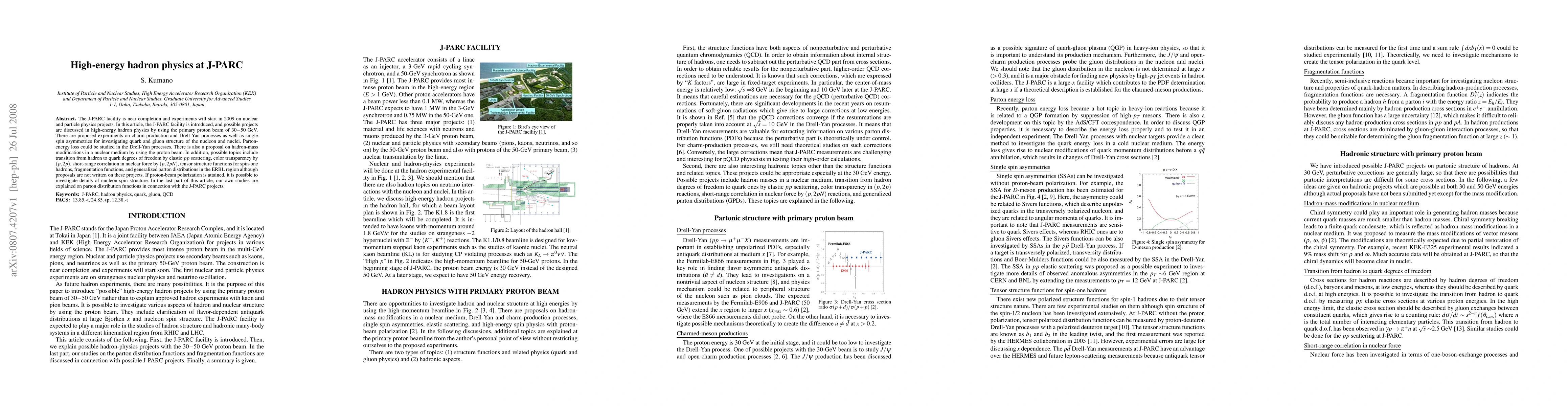The J-PARC facility is near completion and experiments will start in 2009 on nuclear and particle physics projects. In this article, the J-PARC facility is introduced, and possible projects are discussed in high-energy hadron physics by using the primary proton beam of 30-50 GeV. There are proposed experiments on charm-production and Drell-Yan processes as well as single spin asymmetries for investigating quark and gluon structure of the nucleon and nuclei. Parton-energy loss could be studied in the Drell-Yan processes. There is also a proposal on hadron-mass modifications in a nuclear medium by using the proton beam. In addition, possible topics include transition from hadron to quark degrees of freedom by elastic pp scattering, color transparency by (p,2p), short-range correlation in nuclear force by (p,2pN), tensor structure functions for spin-one hadrons, fragmentation functions, and generalized parton distributions in the ERBL region although proposals are not written on these projects. If proton-beam polarization is attained, it is possible to investigate details of nucleon spin structure. In the last part of this article, our own studies are explained on parton distribution functions in connection with the J-PARC projects.