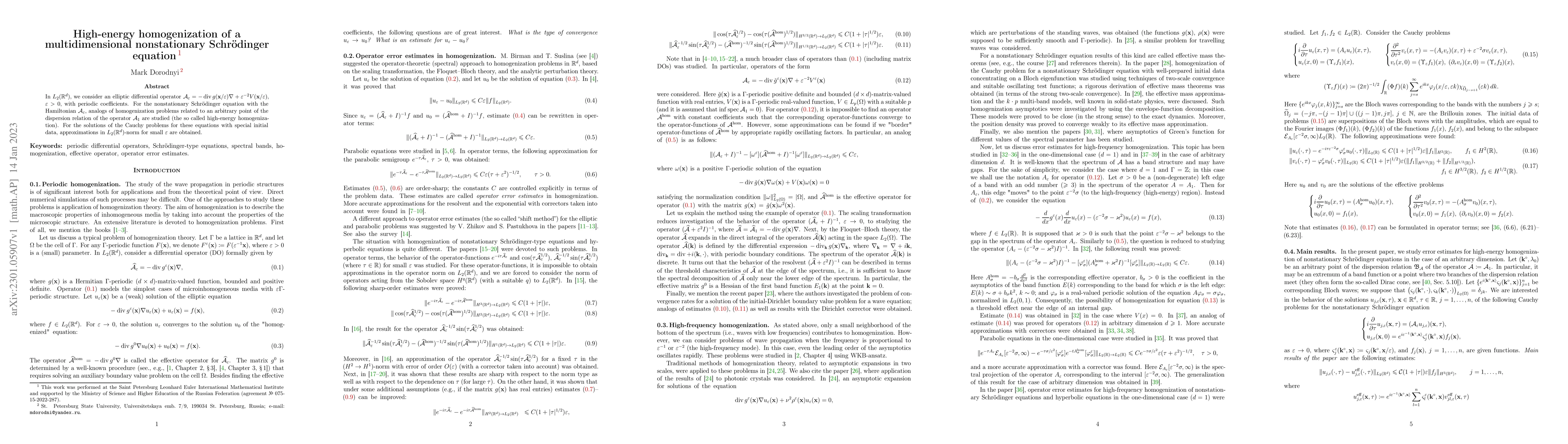 This paper studies high-energy homogenization of a multidimensional nonstationary Schrödinger equation with an elliptic differential operator featuring periodic coefficients. Approximations in $L_2(\mathbb{R}^d)$-norm for the solutions of the Cauchy problems are derived for small perturbations.