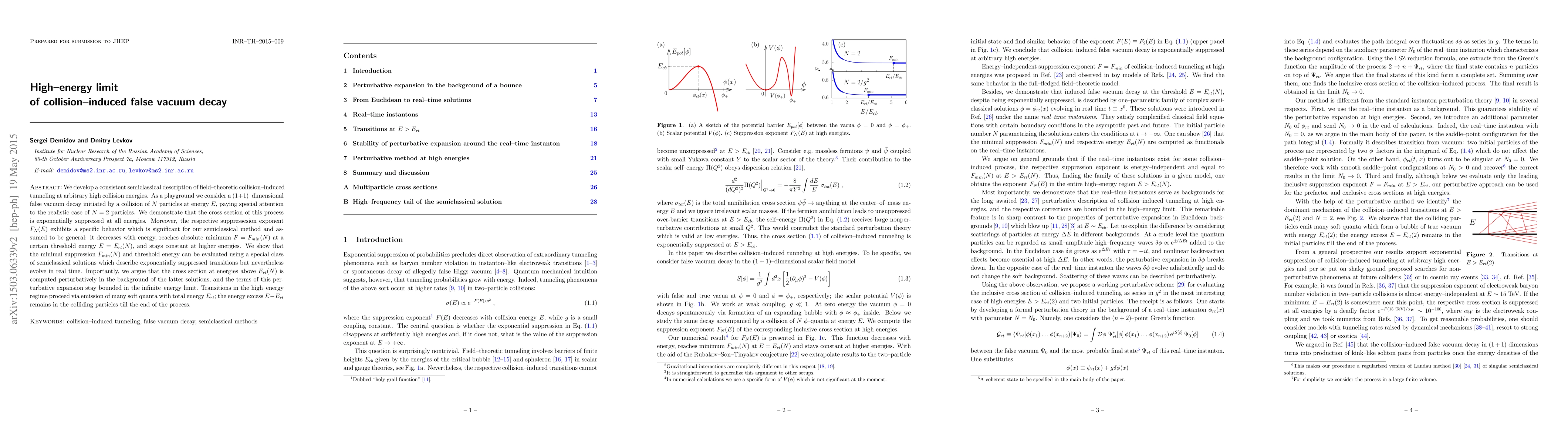 We develop a consistent semiclassical description of field-theoretic collision-induced tunneling at arbitrary high collision energies. As a playground we consider a (1+1)-dimensional false vacuum decay initiated by a collision of N particles at energy E, paying special attention to the realistic case of N=2 particles. We demonstrate that the cross section of this process is exponentially suppressed at all energies. Moreover, the respective suppressesion exponent F_N(E) exhibits a specific behavior which is significant for our semiclassical method and assumed to be general: it decreases with energy, reaches absolute minimum F=F_min(N) at a certain threshold energy E=E_rt(N), and stays constant at higher energies. We show that the minimal suppression F_min(N) and threshold energy can be evaluated using a special class of semiclassical solutions which describe exponentially suppressed transitions but nevertheless evolve in real time. Importantly, we argue that the cross section at energies above E_rt(N) is computed perturbatively in the background of the latter solutions, and the terms of this perturbative expansion stay bounded in the infinite-energy limit. Transitions in the high-energy regime proceed via emission of many soft quanta with total energy E_rt; the energy excess E-E_rt remains in the colliding particles till the end of the process.