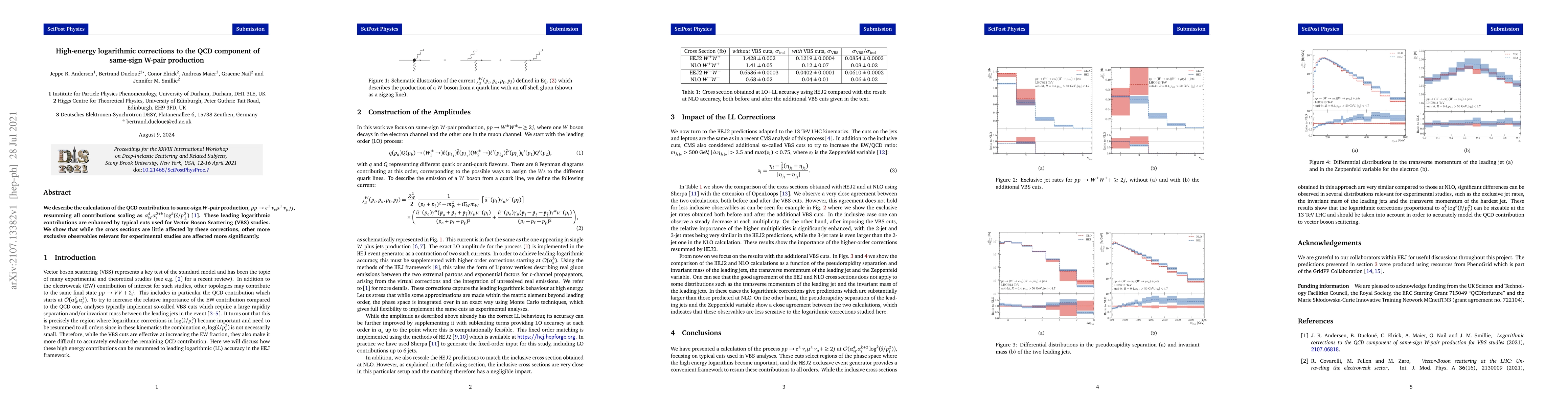 This paper calculates high-energy logarithmic corrections to the QCD component of same-sign $W$-pair production, finding that while total cross sections are minimally affected, more exclusive observables used in experimental studies are significantly impacted. The study focuses on resummation of contributions scaling with $\alpha_W^4 \alpha_s^{2+k}\log^k(\hat s/p_\perp^2)$.