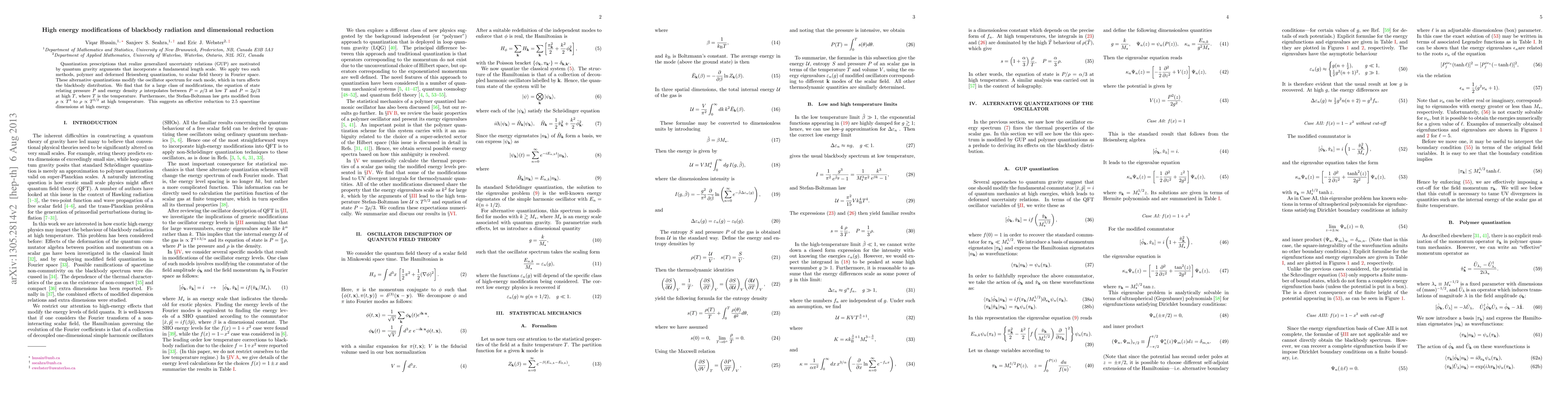 This research applies quantization methods, polymer and deformed Heisenberg, to scalar field theory, modifying blackbody radiation. It finds that at high temperatures, the equation of state changes, and the Stefan-Boltzman law shifts from T^4 to T^5/2, implying an effective reduction to 2.5 spacetime dimensions at high energy.