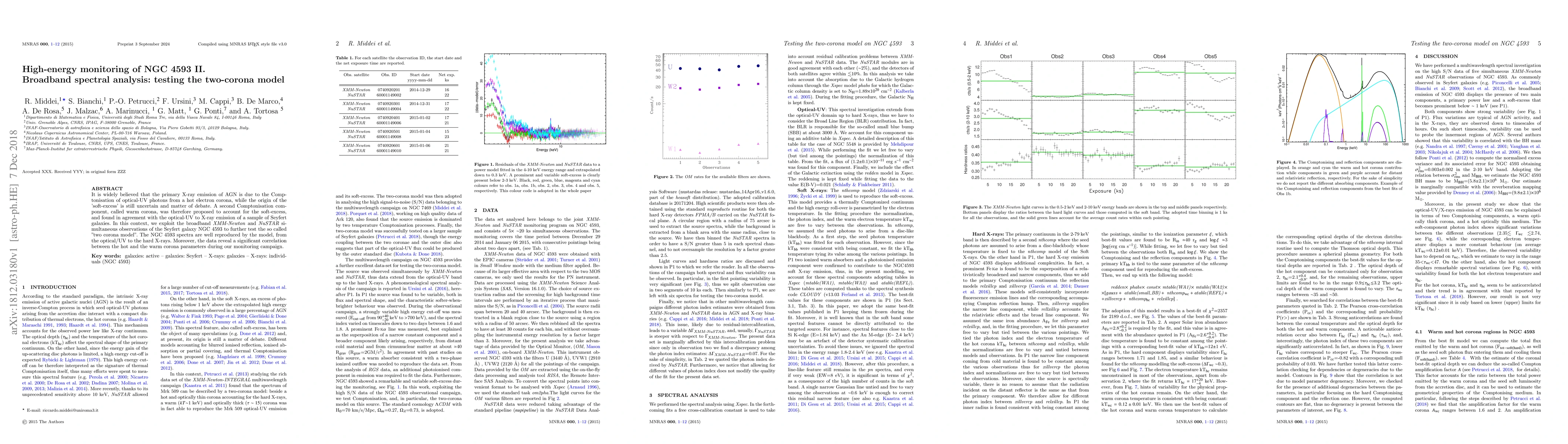 It is widely believed that the primary X-ray emission of AGN is due to the Comptonisation of optical-UV photons from a hot electron corona, while the origin of the 'soft-excess' is still uncertain and matter of debate. A second Comptonisation component, called warm corona, was therefore proposed to account for the soft-excess, and found in agreement with the optical-UV to X-ray emission of a sample of Seyfert galaxies. In this context, we exploit the broadband XMM-Newton and NuSTAR simultaneous observations of the Seyfert galaxy NGC 4593 to further test the so called "two corona model". The NGC 4593 spectra are well reproduced by the model, from the optical/UV to the hard X-rays. Moreover, the data reveal a significant correlation between the hot and the warm corona parameters during our monitoring campaign.