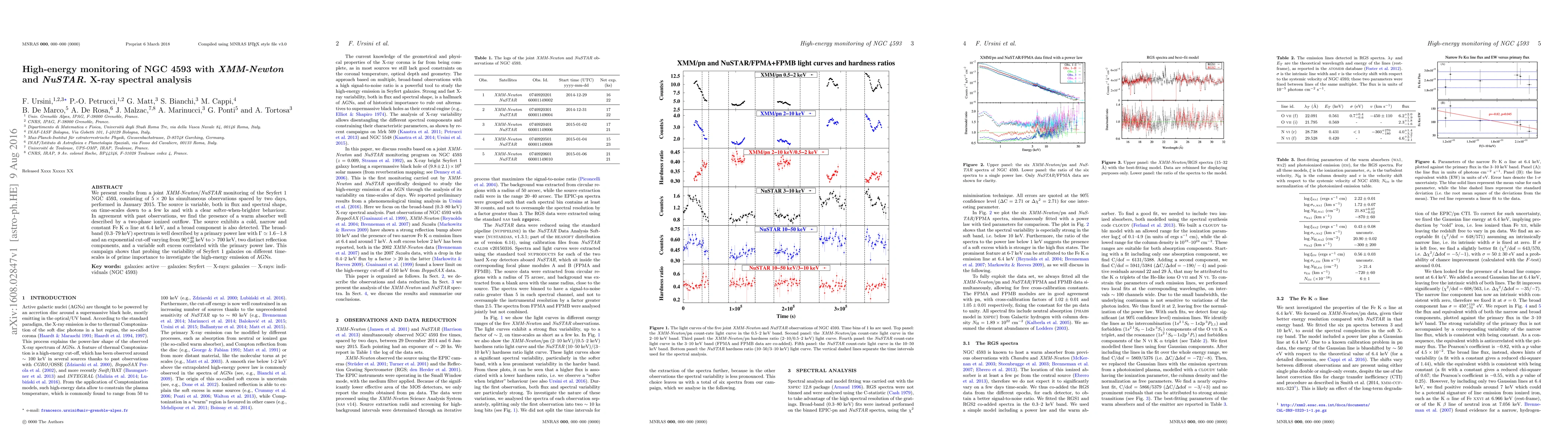 The study uses XMM-Newton and NuSTAR to monitor the Seyfert 1 galaxy NGC 4593, revealing rapid variability in flux and spectral shape on short timescales. The findings include a two-phase ionized outflow, a constant narrow Fe K alpha line, and a broad component, all described by a primary power law with a cut-off and reflection components. The research emphasizes the importance of observing variability in Seyfert 1 galaxies to understand the high-energy emission of Active Galactic Nuclei.