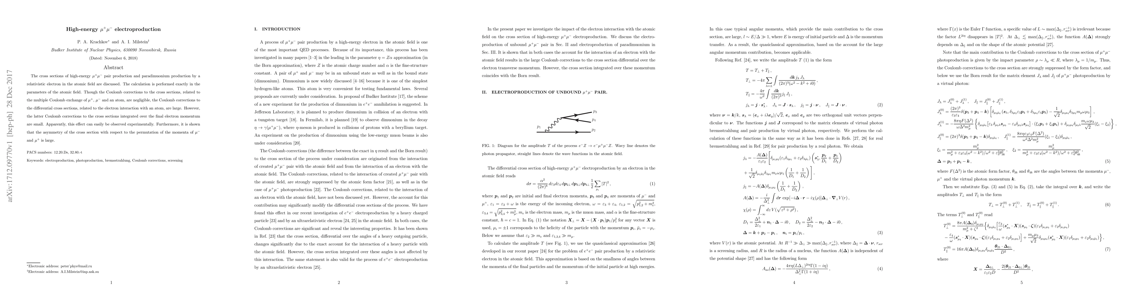 The cross sections of high-energy $\mu^+\mu^-$ pair production and paradimuonium production by a relativistic electron in the atomic field are discussed. The calculation is performed exactly in the parameters of the atomic field. Though the Coulomb corrections to the cross sections, related to the multiple Coulomb exchange of $\mu^+,\,\mu^-$ and an atom, are negligible, the Coulomb corrections to the differential cross sections, related to the electron interaction with an atom, are large. However, the latter Coulomb corrections to the cross sections integrated over the final electron momentum are small. Apparently, this effect can easily be observed experimentally. Furthermore, it is shown that the asymmetry of the cross section with respect to the permutation of the momenta of $\mu^-$ and $\mu^+$ is large.