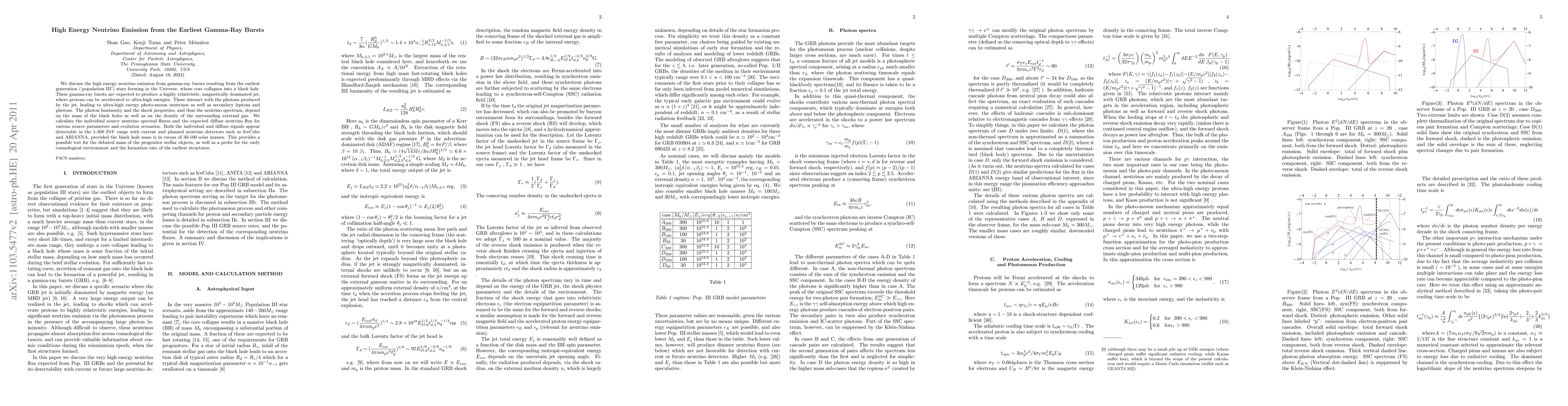 This paper investigates high energy neutrino emissions from gamma-ray bursts originating from the earliest stars (population III) whose core collapses into black holes. It predicts detectable neutrino signals in the 1-300 PeV range with current detectors, offering insights into the progenitor star mass and early cosmological conditions.