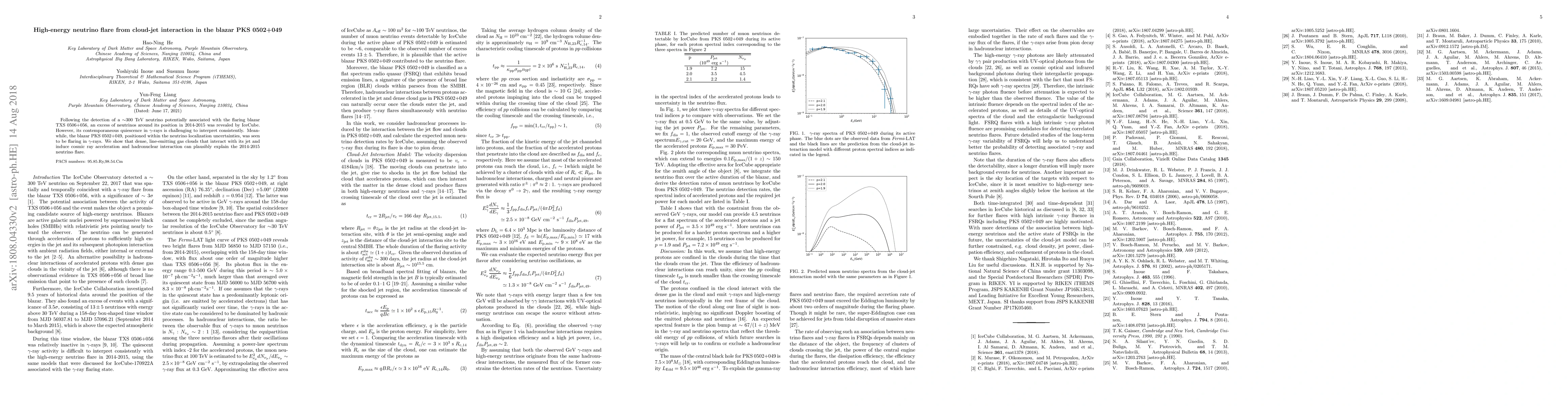 This paper investigates a high-energy neutrino flare detected by IceCube, potentially linked to the blazar PKS 0502+049, which was flaring in gamma rays. The authors propose that interactions between the jet and dense gas clouds in the blazar's environment can explain the neutrino emission.