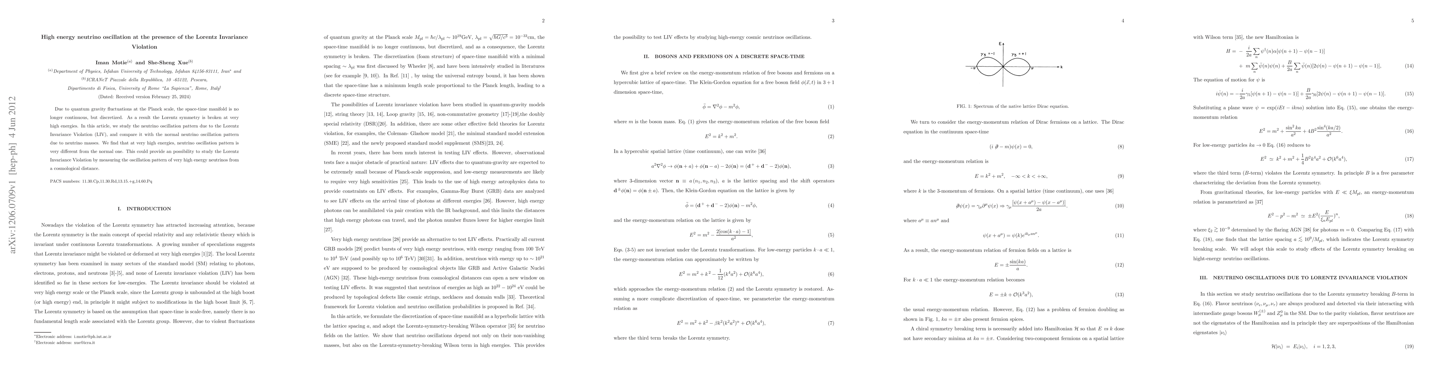 Due to quantum gravity fluctuations at the Planck scale, the space-time manifold is no longer continuous, but discretized. As a result the Lorentz symmetry is broken at very high energies. In this article, we study the neutrino oscillation pattern due to the Lorentz Invariance Violation (LIV), and compare it with the normal neutrino oscillation pattern due to neutrino masses. We find that at very high energies, neutrino oscillation pattern is very different from the normal one. This could provide an possibility to study the Lorentz Invariance Violation by measuring the oscillation pattern of very high energy neutrinos from a cosmological distance.