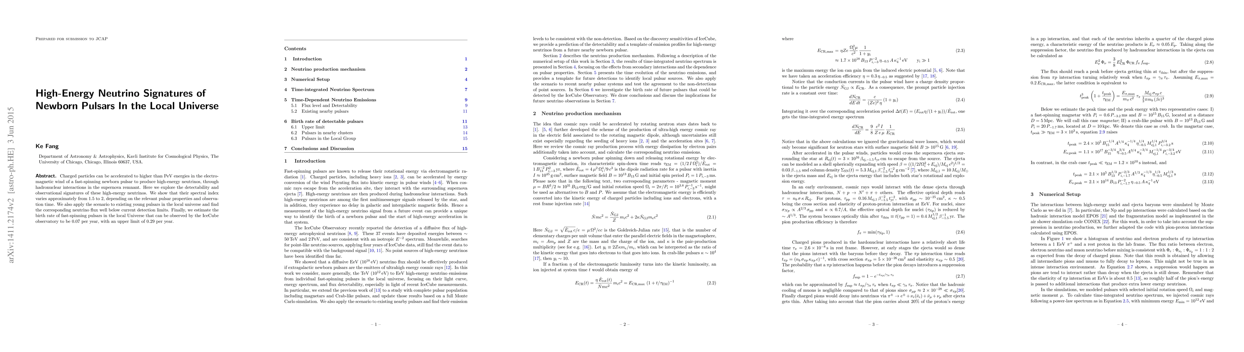 Charged particles can be accelerated to higher than PeV energies in the electro-magnetic wind of a fast-spinning newborn pulsar to produce high-energy neutrinos, through hadronuclear interactions in the supernova remnant. Here we explore the detectability and observational signatures of these high-energy neutrinos. We show that their spectral index varies approximately from 1.5 to 2, depending on the relevant pulsar properties and observation time. We also apply the scenario to existing young pulsars in the local universe and find the corresponding neutrino flux well below current detection limits. Finally, we estimate the birth rate of fast-spinning pulsars in the local Universe that can be observed by the IceCube observatory to be 0.07 per year, with an upper limit of 0.29 per year.