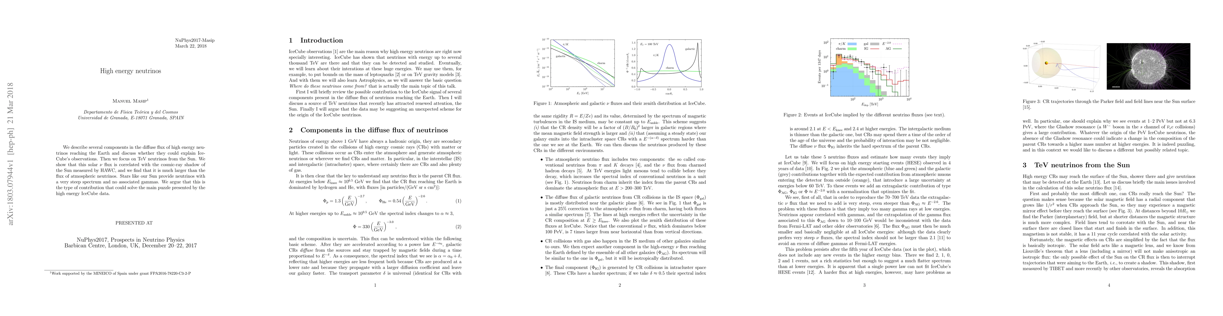 We describe several components in the diffuse flux of high energy neutrinos reaching the Earth and discuss whether they could explain IceCube's observations. Then we focus on TeV neutrinos from the Sun. We show that this solar neutrino flux is correlated with the cosmic-ray shadow of the Sun measured by HAWC, and we find that it is much larger than the flux of atmospheric neutrinos. Stars like our Sun provide neutrinos with a very steep spectrum and no associated gammas. We argue that this is the type of contribution that could solve the main puzzle presented by the high energy IceCube data.