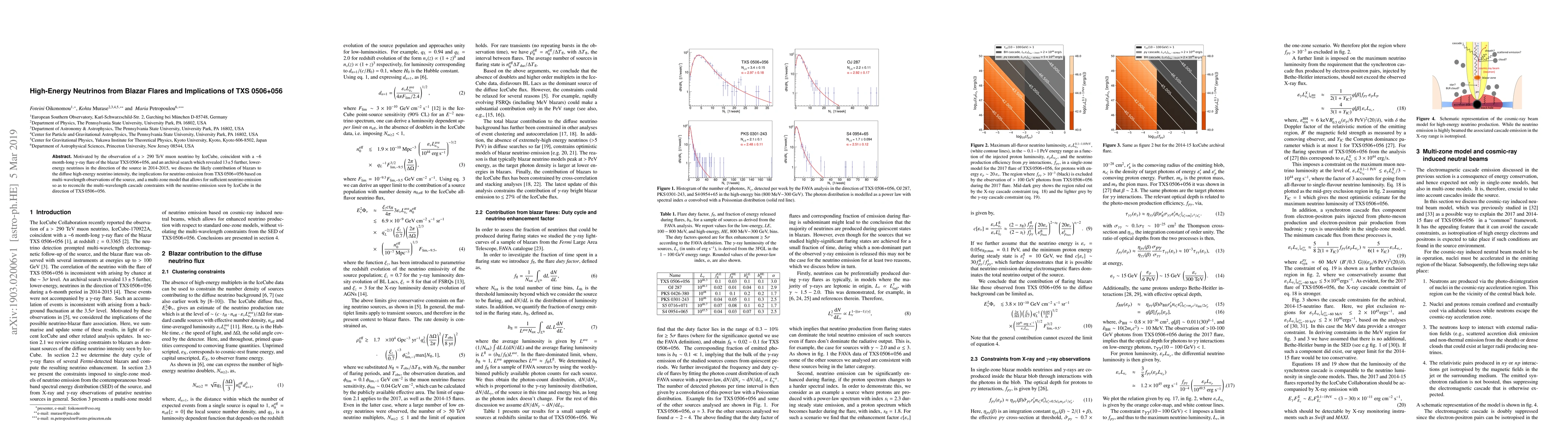 Motivated by the observation of a $>290$ TeV muon neutrino by IceCube, coincident with a $\sim$6 month-long $\gamma$-ray flare of the blazar TXS 0506+056, and an archival search which revealed $13 \pm 5$ further, lower-energy neutrinos in the direction of the source in 2014-2015, we discuss the likely contribution of blazars to the diffuse high-energy neutrino intensity, the implications for neutrino emission from TXS 0506+056 based on multi-wavelength observations of the source, and a multi-zone model that allows for sufficient neutrino emission so as to reconcile the multi-wavelength cascade constraints with the neutrino emission seen by IceCube in the direction of TXS 0506+056.