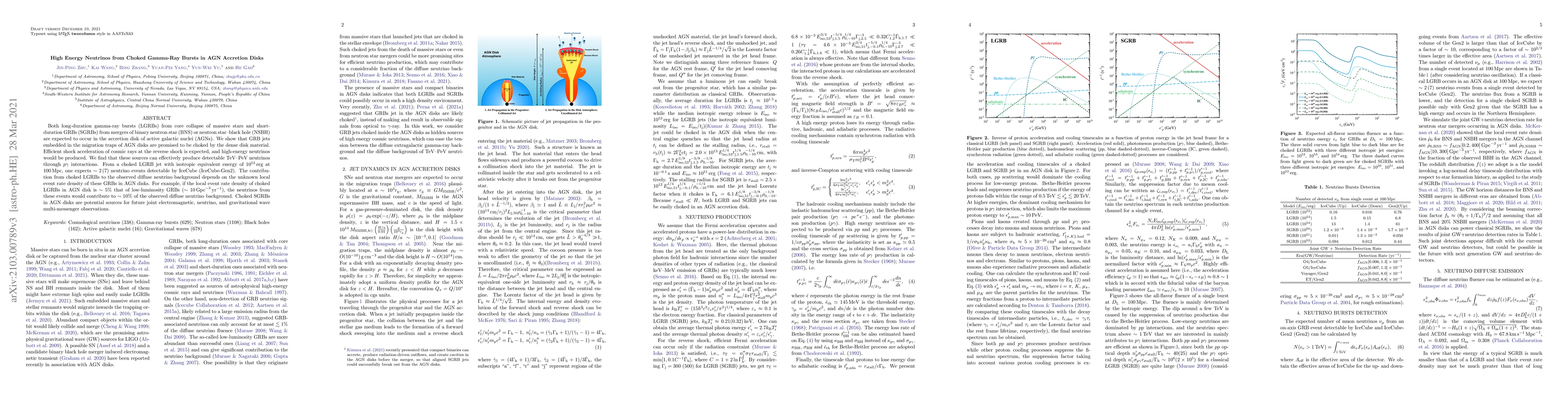 This paper investigates high-energy neutrino production from choked gamma-ray bursts (GRBs) in active galactic nuclei (AGN) accretion disks, suggesting that dense disk material can obstruct GRB jets, leading to efficient cosmic ray acceleration and detectable TeV-PeV neutrino emissions. The study estimates that such events could contribute significantly to the observed diffuse neutrino background and offers potential for multi-messenger observations.