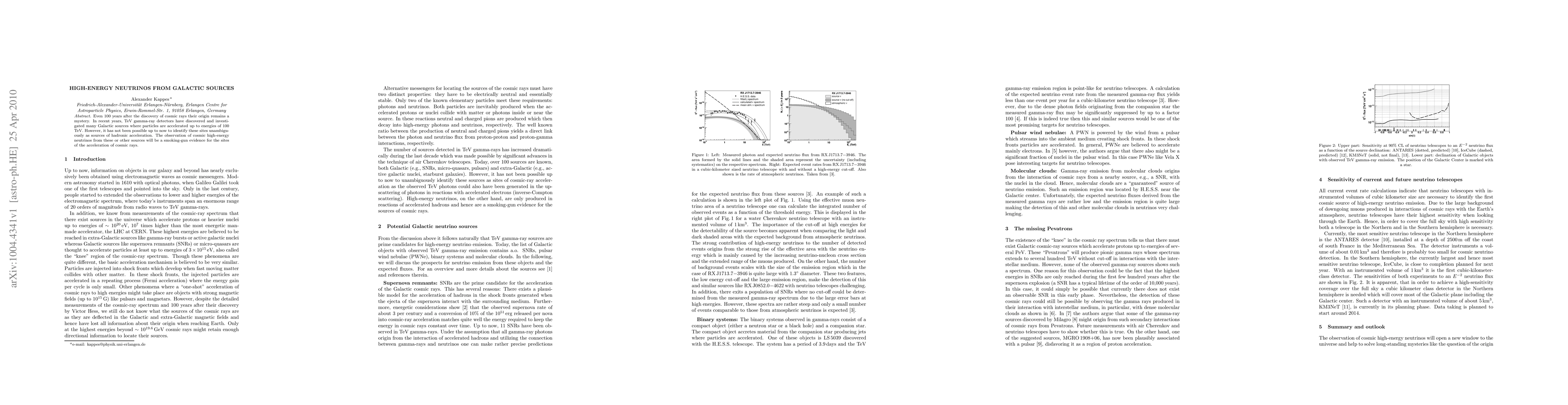 Even 100 years after the discovery of cosmic rays their origin remains a mystery. In recent years, TeV gamma-ray detectors have discovered and investigated many Galactic sources where particles are accelerated up to energies of 100 TeV. However, it has not been possible up to now to identify these sites unambiguously as sources of hadronic acceleration. The observation of cosmic high-energy neutrinos from these or other sources will be a smoking-gun evidence for the sites of the acceleration of cosmic rays.