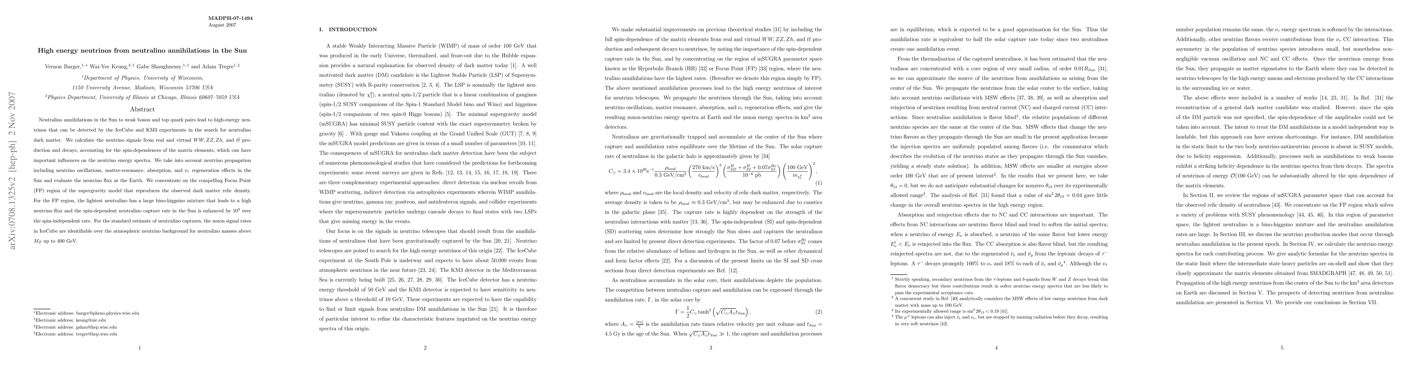 This paper investigates high-energy neutrinos from neutralino annihilations in the Sun, focusing on the Focus Point region of the supergravity model. It calculates neutrino signals from various annihilation processes and considers effects like neutrino oscillations and absorption, predicting detectable muon signals in IceCube for neutralino masses above 100 GeV.