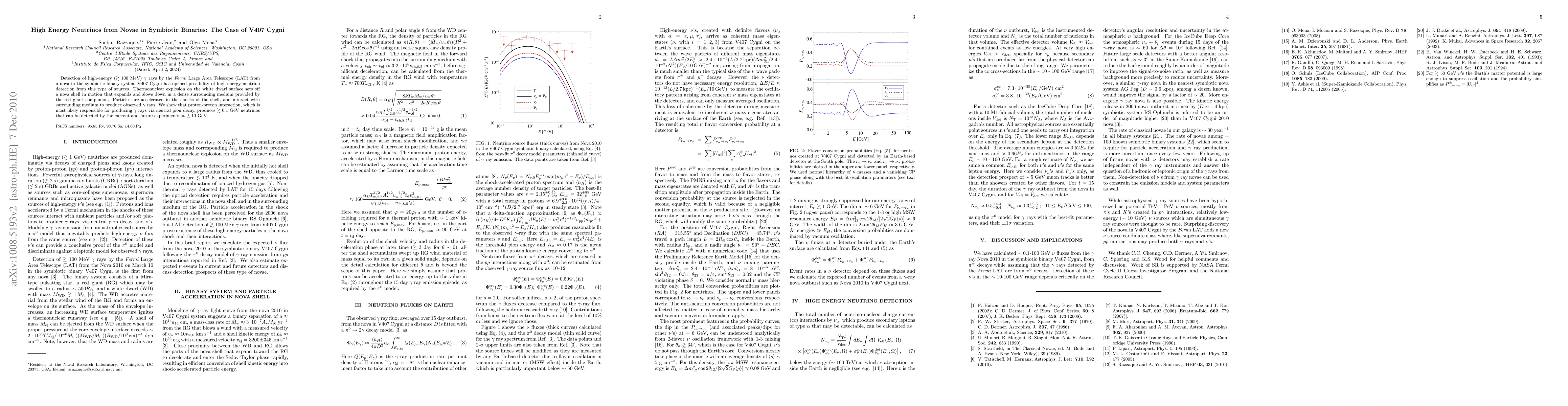 High-energy neutrinos can be detected from symbiotic binaries like V407 Cygni after a nova explosion, which accelerates particles that interact with the surrounding medium to produce high-energy neutrinos and gamma rays.