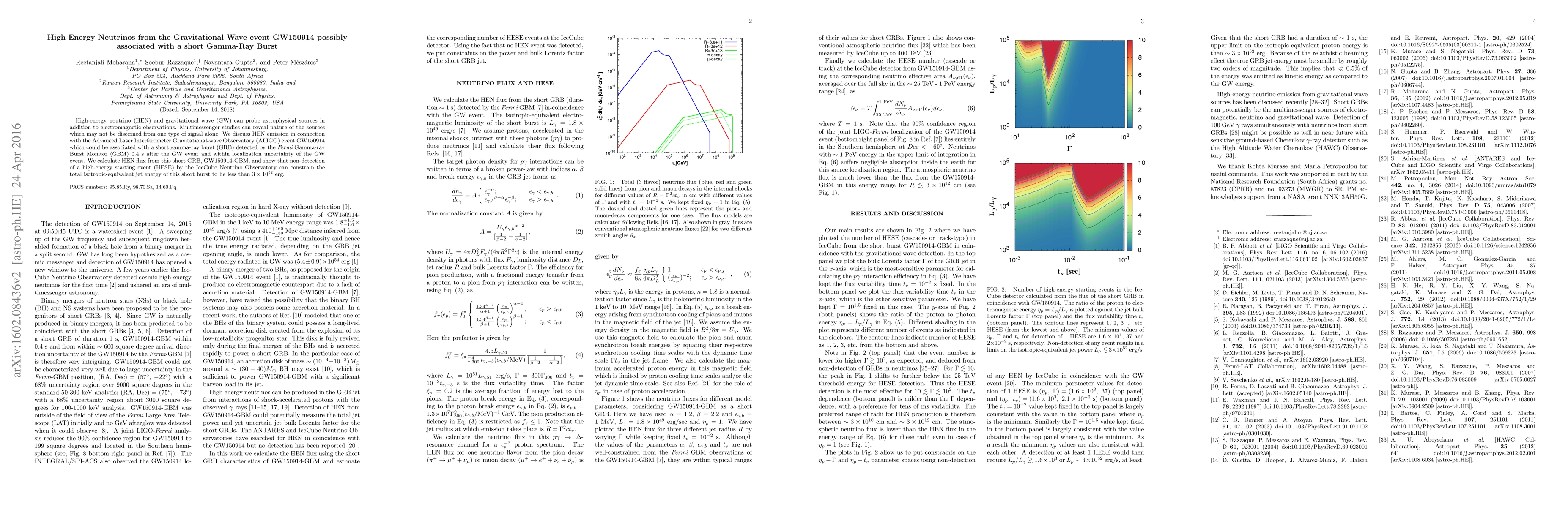 High-energy neutrino (HEN) and gravitational wave (GW) can probe astrophysical sources in addition to electromagnetic observations. Multimessenger studies can reveal nature of the sources which may not be discerned from one type of signal alone. We discuss HEN emission in connection with the Advanced Laser Interferometer Gravitational-wave Observatory (ALIGO) event GW150914 which could be associated with a short gamma-ray burst (GRB) detected by the $Fermi$ Gamma-ray Burst Monitor (GBM) 0.4 s after the GW event and within localization uncertainty of the GW event. We calculate HEN flux from this short GRB, GW150914-GBM, and show that non-detection of a high-energy starting event (HESE) by the IceCube Neutrino Observatory can constrain the total isotropic-equivalent jet energy of this short burst to be less than $3\times 10^{52}$ erg.